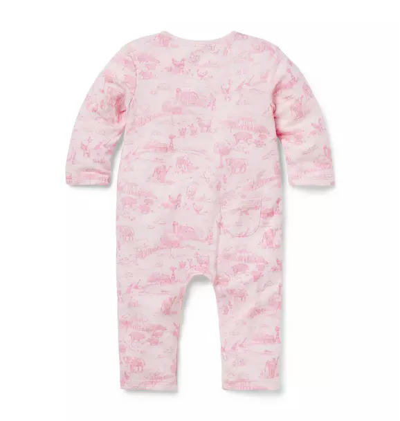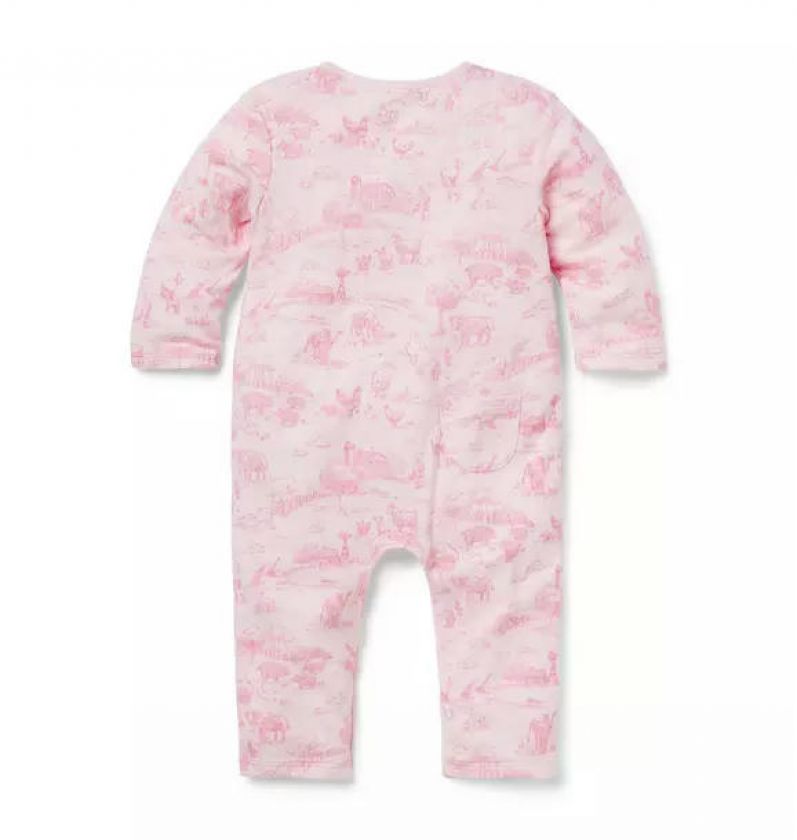 For all of baby's first moments, our farm animal toile one-piece is the perfect choice. Featuring a kimono-inspired wrap silhouette and a little back pocket, just because.