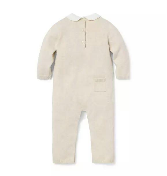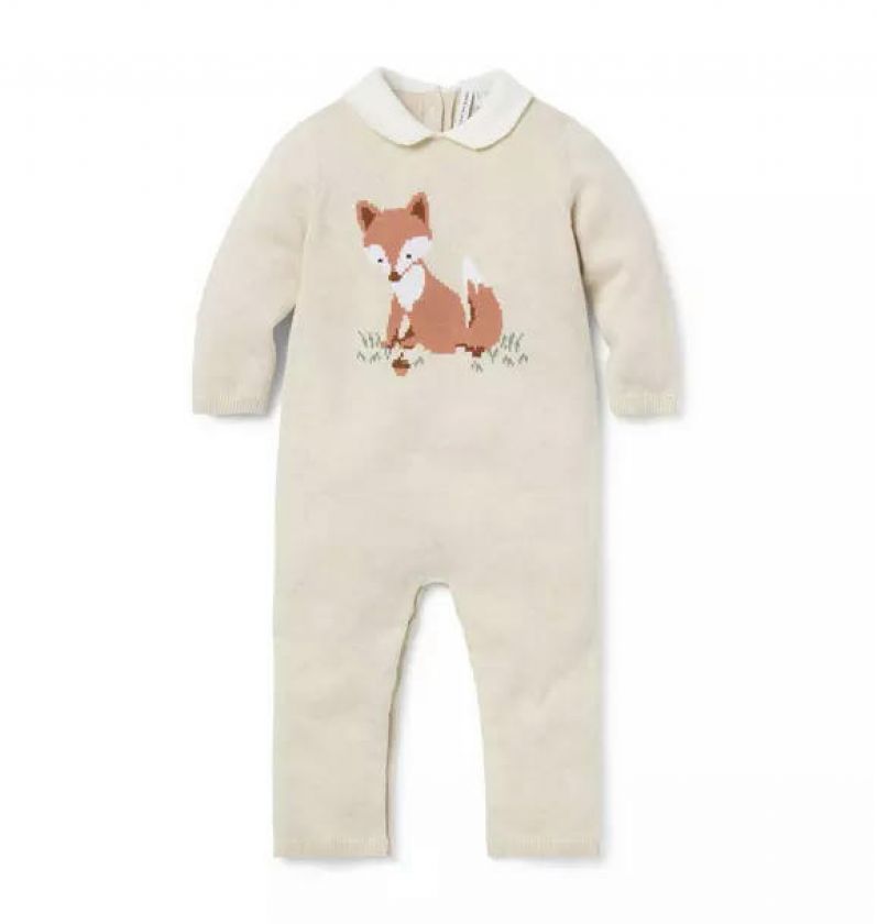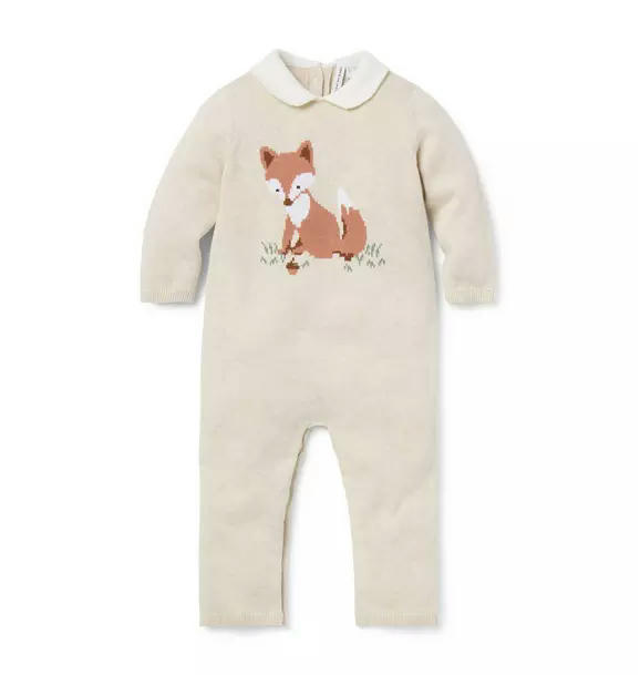 We love this knit one-piece for cozy first moments. In pure cotton with an intarsia-knit fox design and a Peter Pan collar, plus a little back pocket too.