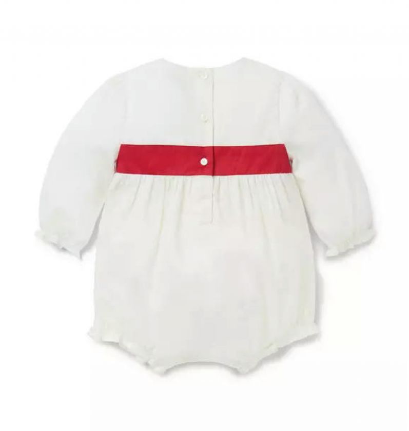 First holiday memories are all wrapped up in a bow with our pure cotton romper. With an oversized bow detail and little ruffles too, it's perfect for holiday photos and special occasions.