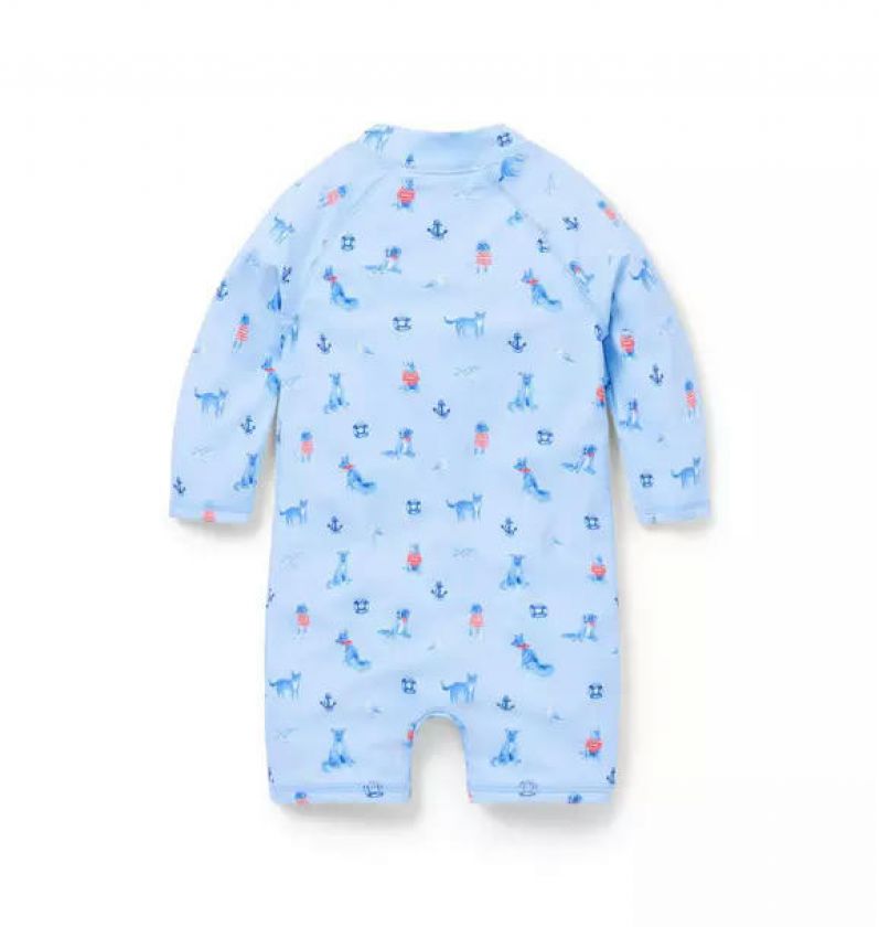 For shipshape style at the beach or the pool, our rash guard swimsuit is just the thing. With an allover nautical dog print, plus UPF 50+ sun protection to help keep them stylishly safe. Responsibly made with recycled polyester fabric.