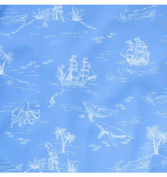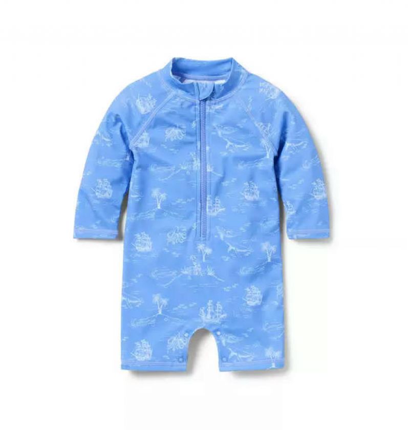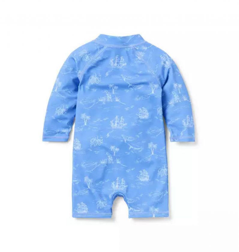 Shipshape style for baby's first splashes. Our rash guard swimsuit features an allover nautical toile, raglan sleeves and a zip front, plus UPF 50+ sun protection for all their adventures. Responsibly made with recycled polyester fabric.