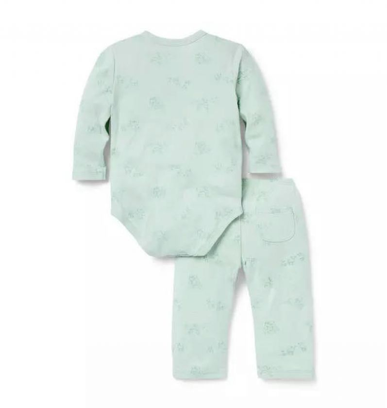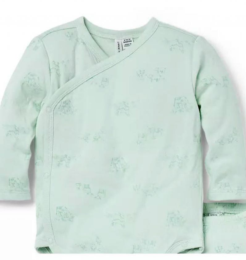 Welcome baby in our soft cotton set featuring an allover farm animal toile. With a kimono-inspired wrap bodysuit and a pull-on pant with a little back pocket, just because.