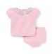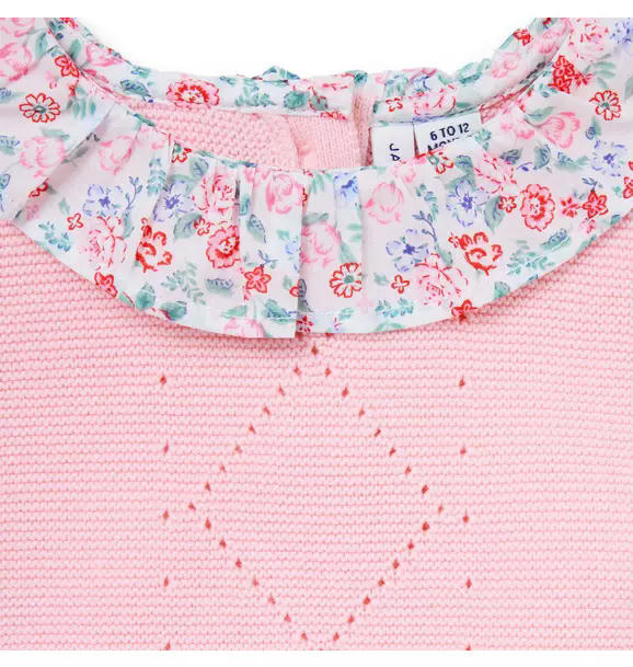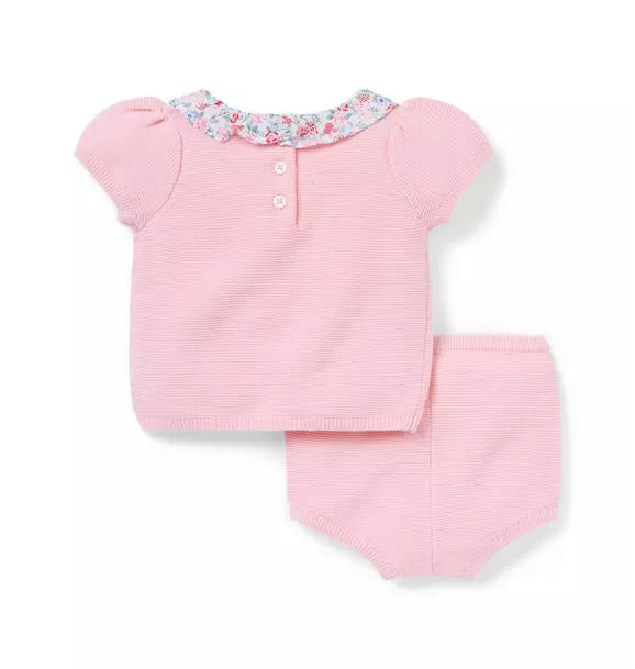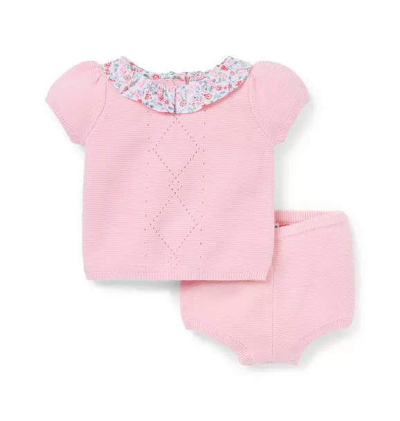 A close-knit favorite for first moments. Our set in soft cotton features pointelle details, puff sleeves and a floral ruffle collar for an extra special touch.