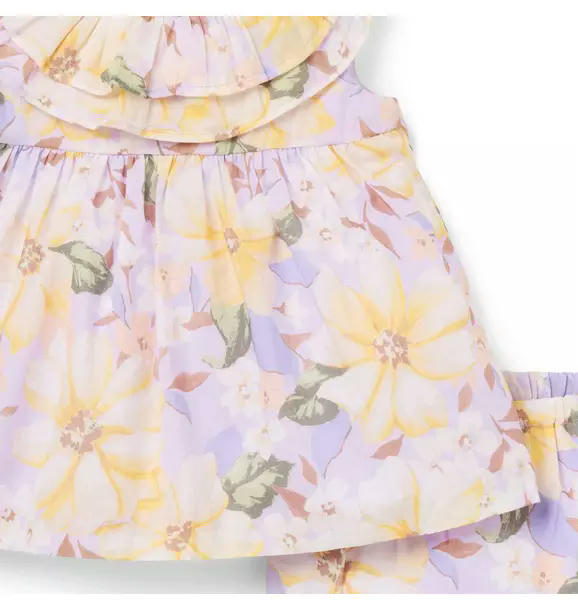 Florals for fashionable first moments. Our set in pure cotton features a double ruffle collar, bow back detail and little ruffle cuffs.