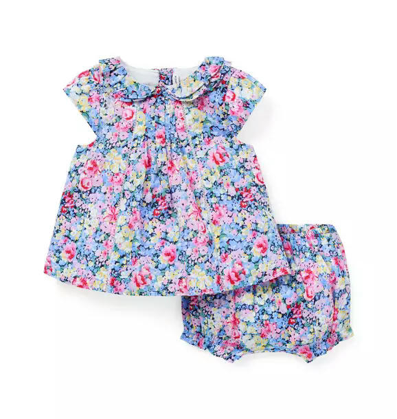 Get set for first moments with our floral matching set. Designed in pure cotton with a double ruffle collar, lace trim and pleated details too.