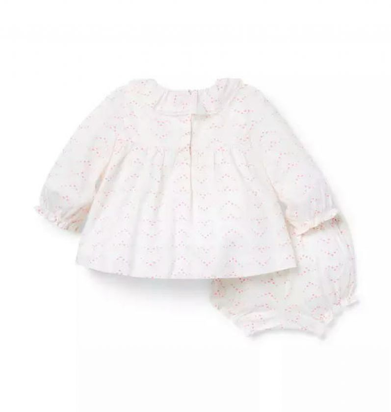 Soft pure cotton, the perfect ruffle collar and hearts—all the details we love for our set. It's the perfect match for baby's first Valentine's Day.