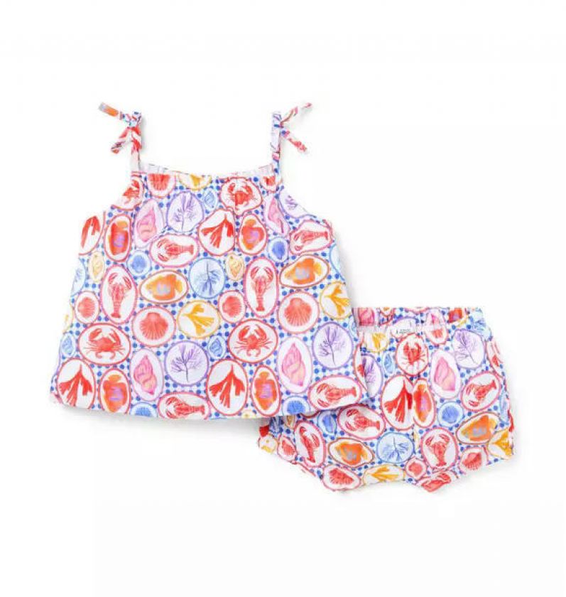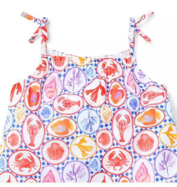All set for first adventures with this favorite in pure, soft cotton. Featuring an ocean icon print, plus bows at the straps and little ruffles too.