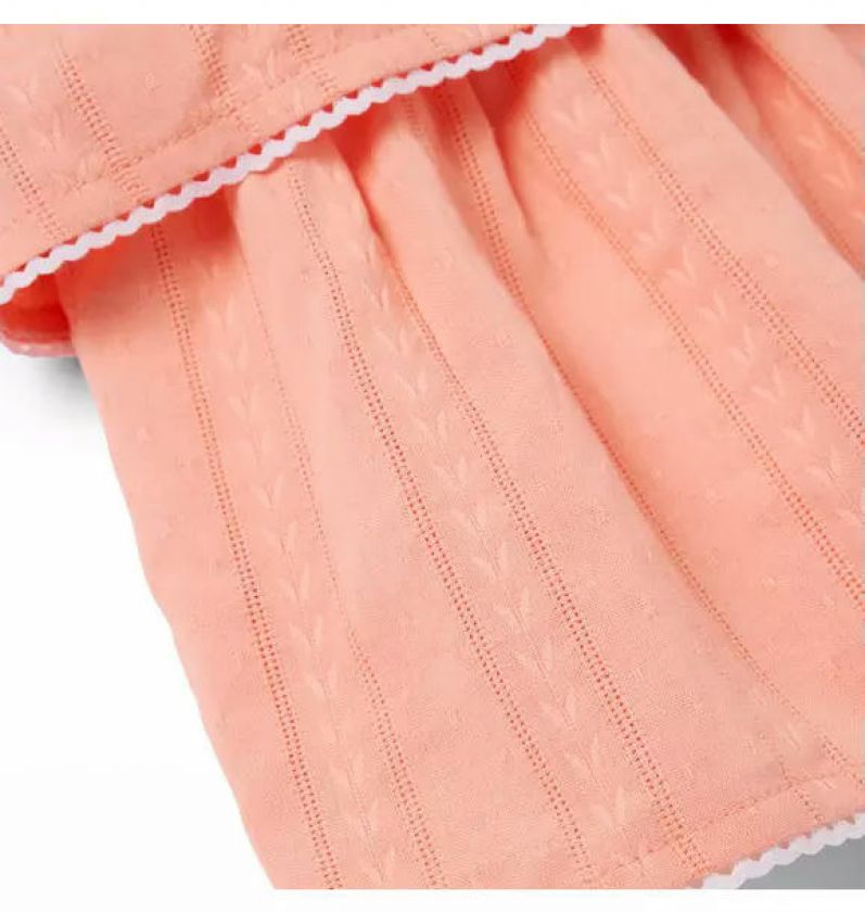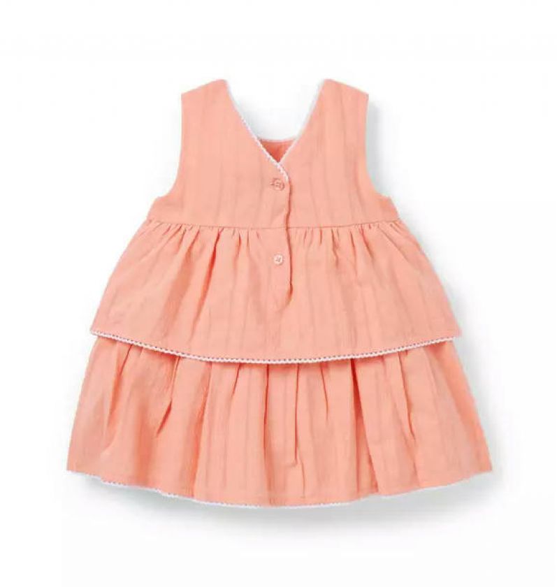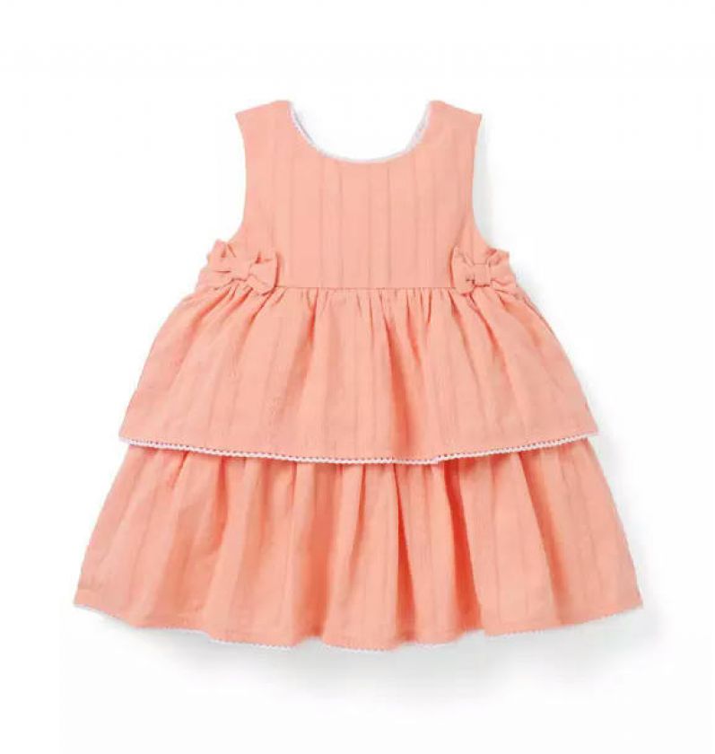 We're smitten with the little details on this tiered dress. Designed in allover textured cotton with crochet lace trim and little bows too.