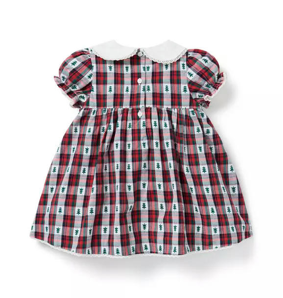 A favorite for first holiday photos and occasions. With a holiday tree tartan, Peter Pan collar, puff sleeves and lace trim too, our pure cotton dress is an instant love.