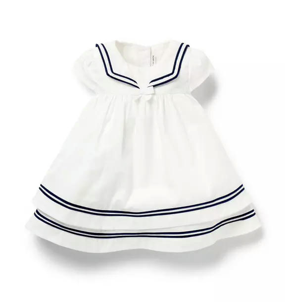 A sea of style for first moments. With a classic sailor collar and bow detail, plus piped trim and puff sleeves, our pure cotton dress is an instant love.