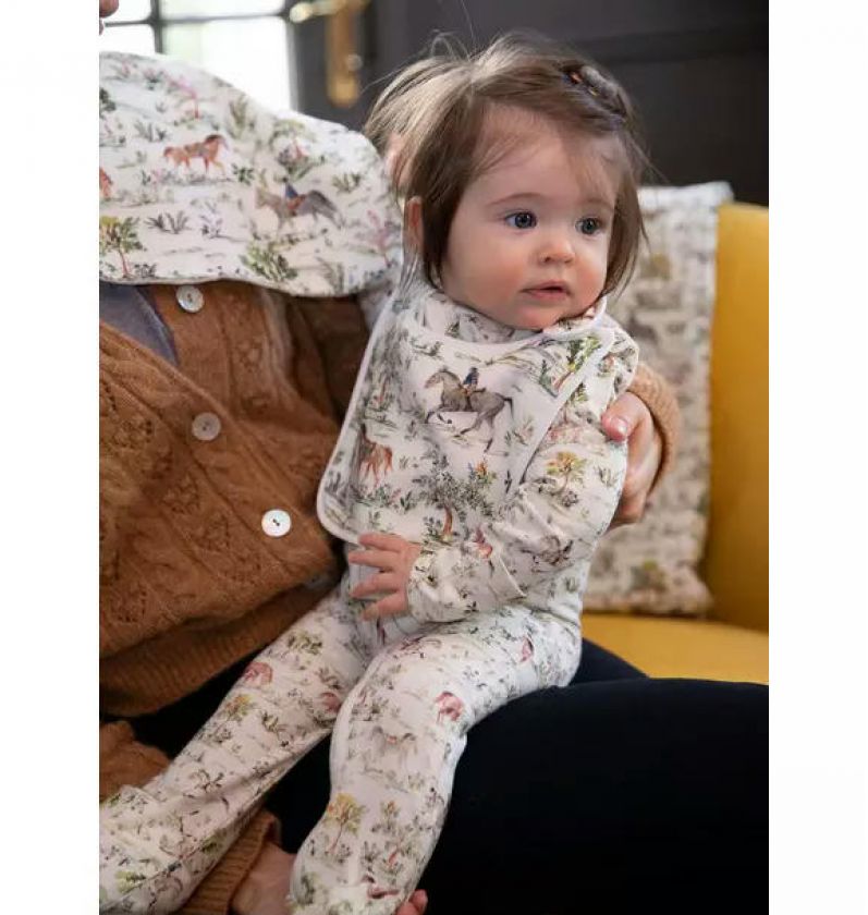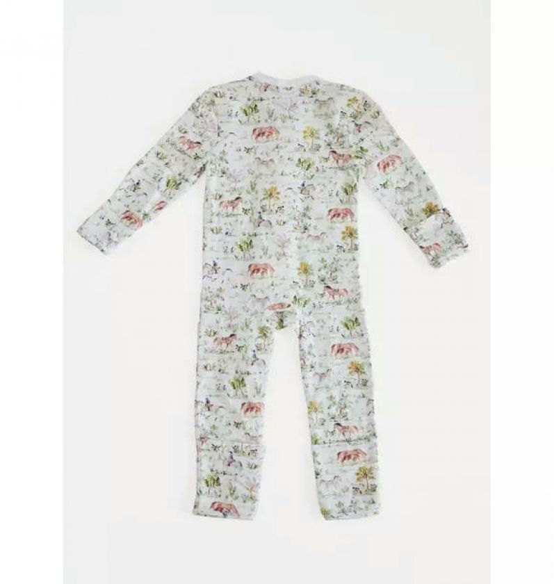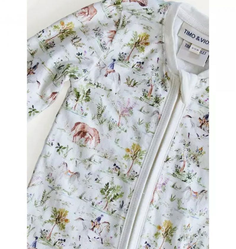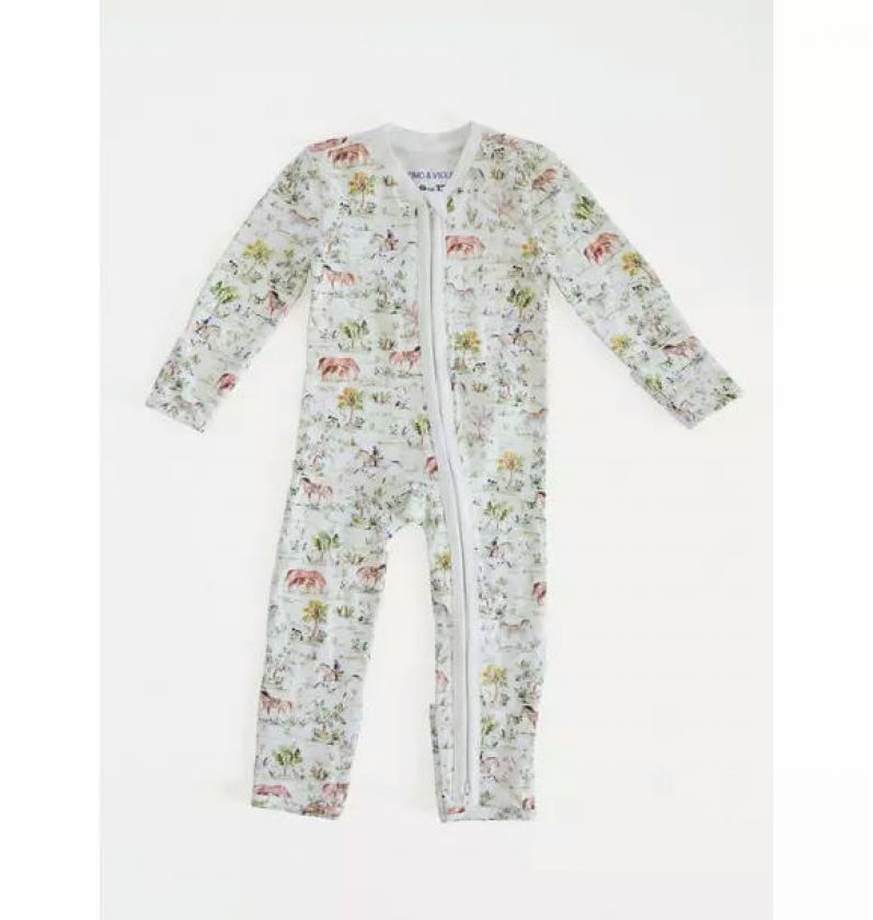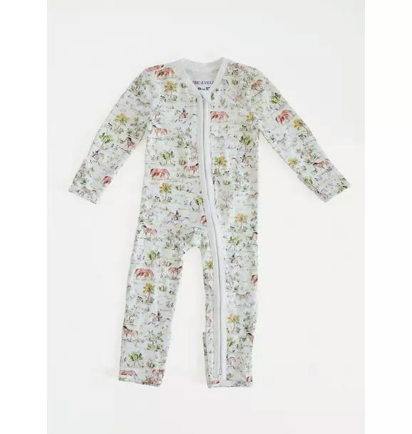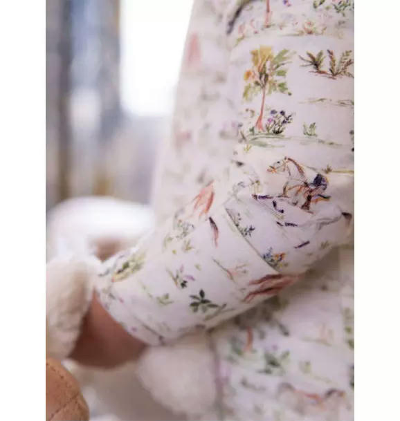 A soft essential, thoughtfully designed. This one-piece in our signature Hunter Pace print is as practical as it is charming. Made for comfort and ease, it features fold-over hand mittens (up to size 9–12 months) to help prevent scratches, convertible foot cuffs for room to grow, and a double zipper for quick, no-fuss diaper changes. Everyday ease, with a little extra joy. **Adheres to CPSC safety regulations and never treated with flame-retardants or chemicals.