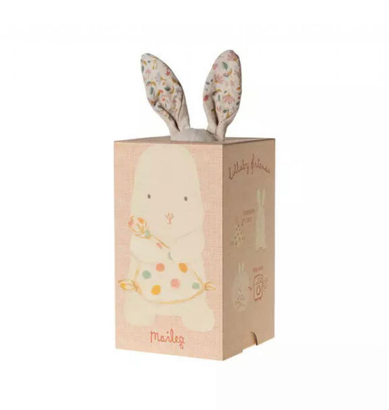 Lullaby friends is a collection of beautiful items for babies. This bunny has a soft cuddle cloth and will play a calm lullaby when you pull the tail. It is made in soft fabrics with unique prints and packed in a beautiful gift box.