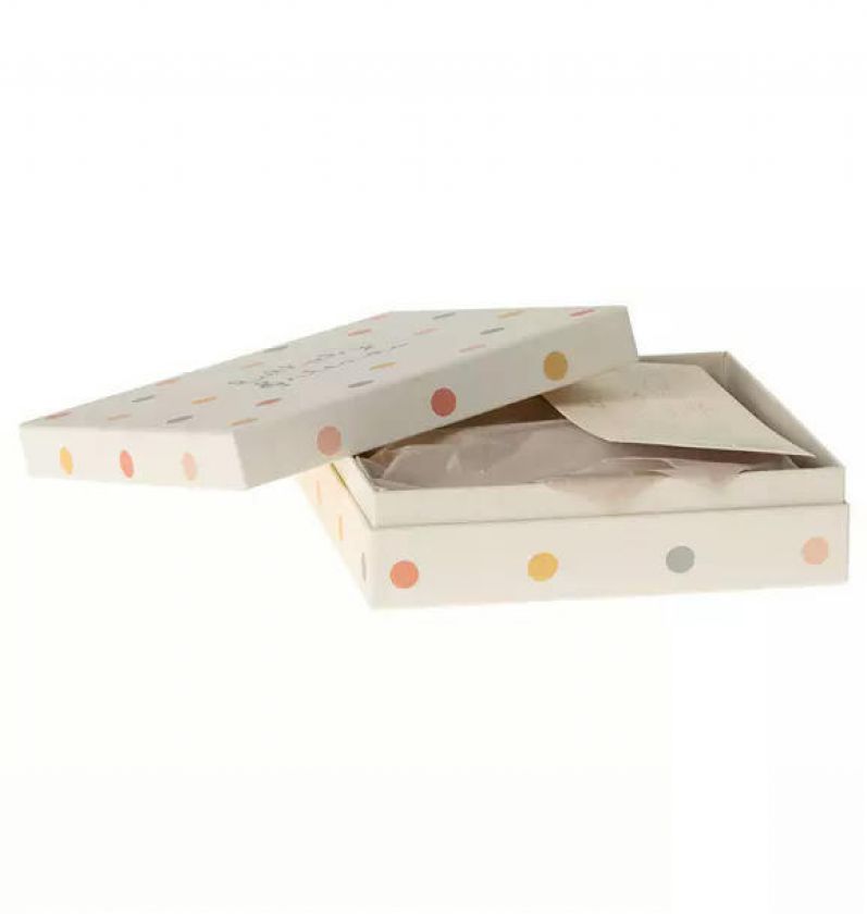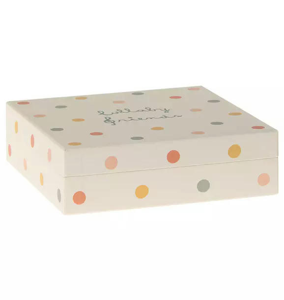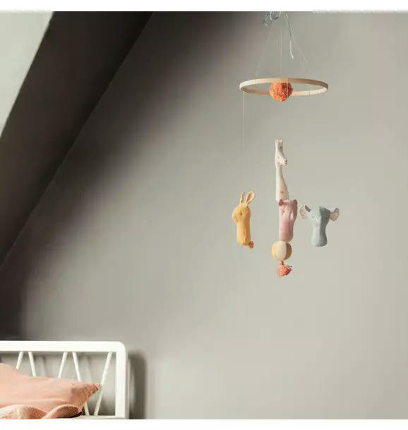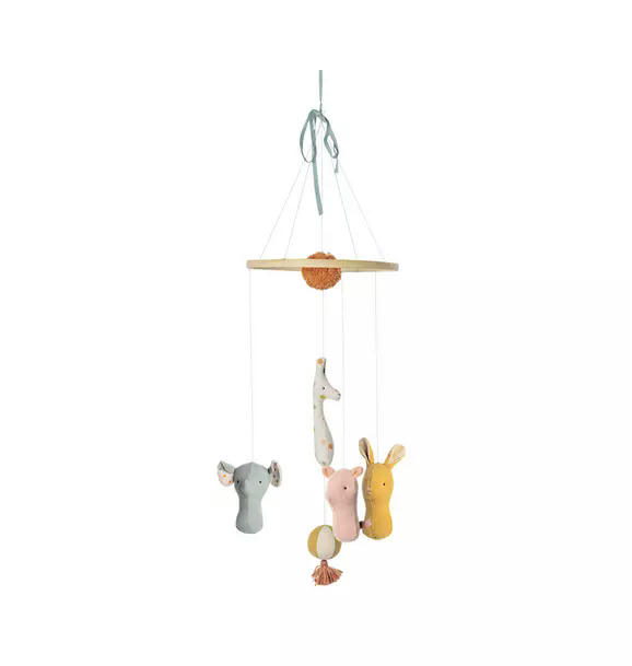 Lullaby friends is a collection with beautiful baby items. This mobile is perfect for the baby to look at from the bed or from the nursery table. The animals are made in soft fabrics with unique prints and are packed in a beautiful gift box.
