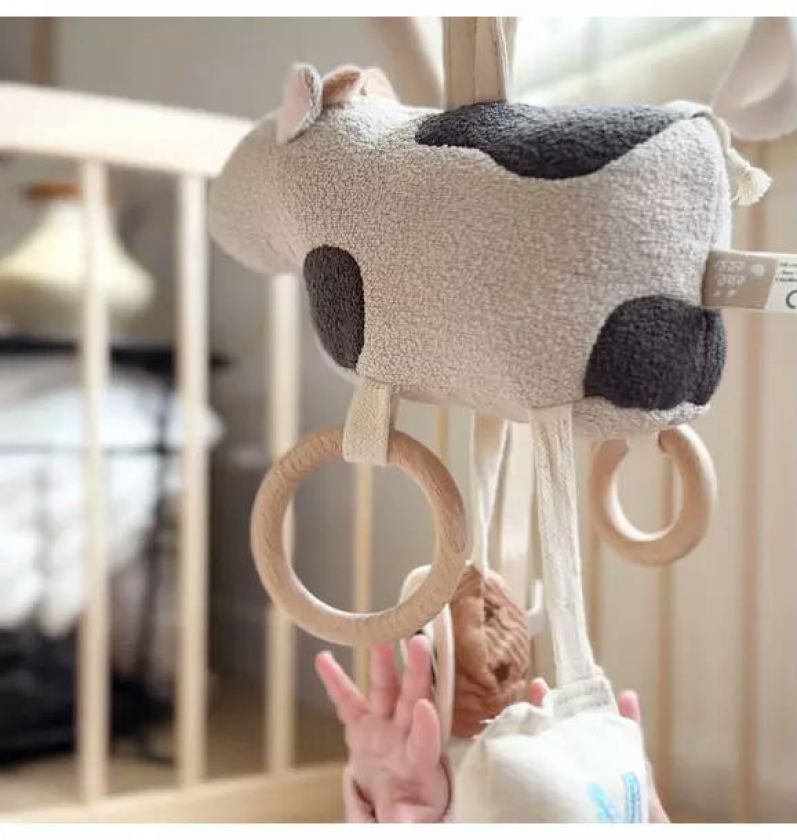 Have your little one accompanied with our MOO MOO cow mobile that rattles in different sounds. Attract the eye of the young baby with the cookie mirror too! The snap strap allows easy attachment to strollers, baby gyms and handles in the back seat of the car. Wooden rings allow an easy grasp by baby too.