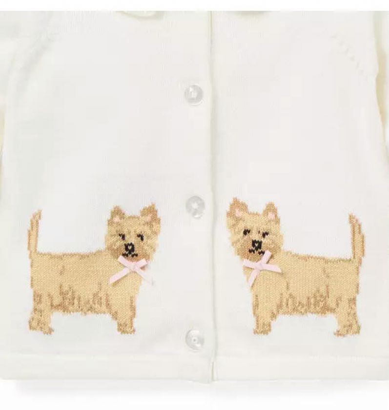 Consider it puppy love. Our cardigan is designed with intarsia-knit dogs, a ruffle trimmed collar and little bow details too.