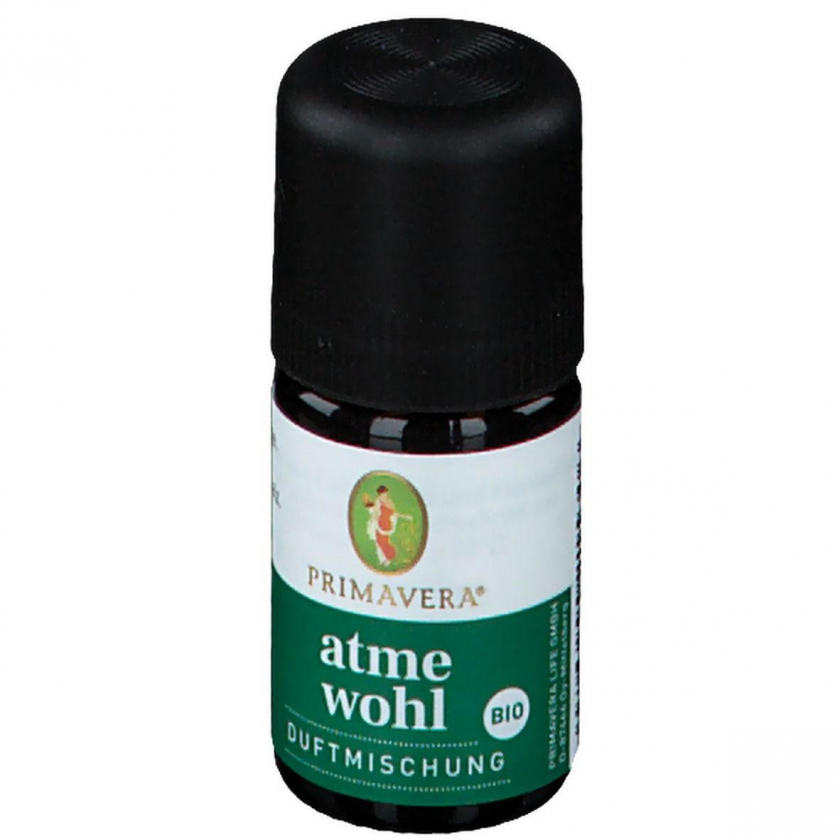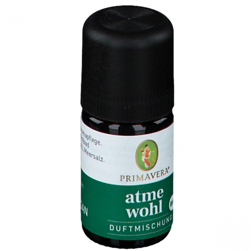 Ароматерапевтическая смесь эфирных масел PRIMAVERA Atmewohl для укрепления иммунитета и улучшения дыхания. Содержит 100% натуральные био-масла эвкалипта, еловой хвои и розмарина. Используется как добавка для ванн для глубокого прогревания тела и укрепления дыхательных путей, особенно в холодное время года. Подходит для взрослых и детей (с разведением). Сертифицирована как био-косметика NATRUE, без тестирования на животных, веганская.