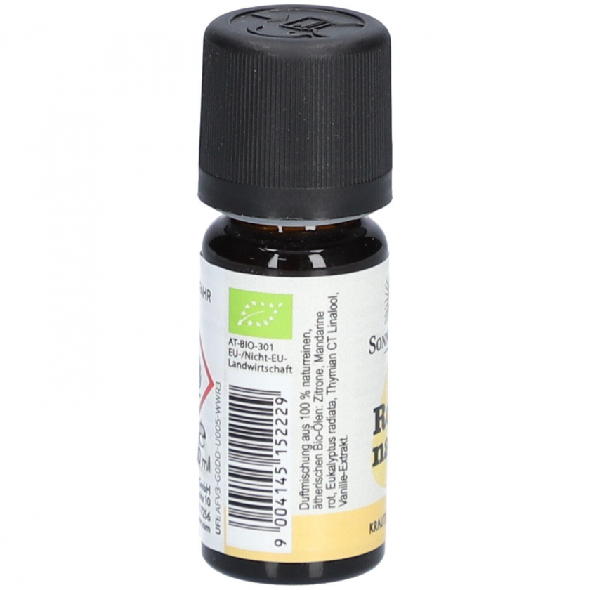 Состав: Эфирное масло лимона био, эфирное масло красного мандарина био, эфирное масло эвкалипта radiata био, эфирное масло тимьяна CT Linalool био, эфирное масло экстракта ванили био