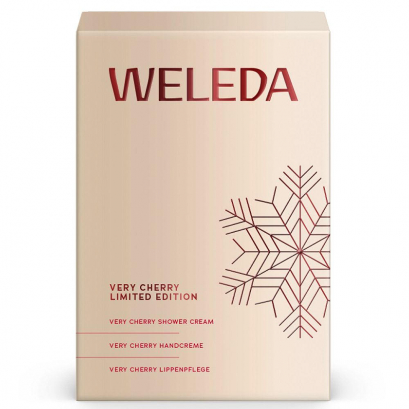 Подарочный набор Weleda Limited Edition Winter 2025 с ароматом темной вишни включает три средства по уходу: душ-крем для тела (200 мл), крем для рук (50 мл) и бальзам для губ (4,8 г). Все продукты содержат 100% ингредиентов натурального происхождения, увлажняют и питают кожу, оставляя приятный вишневый аромат. Набор выполнен в экологичной упаковке для повторного использования.