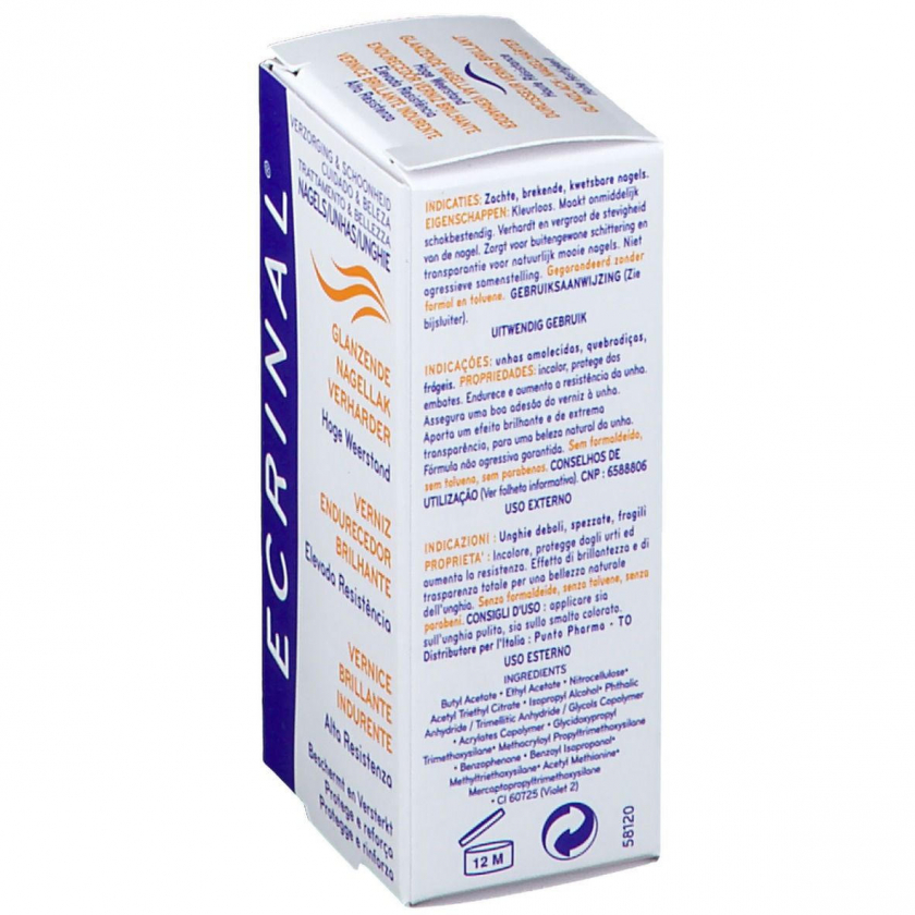 ECRINAL Glanzlack-Nagelhärter - укрепляющее средство для ногтей, которое мгновенно затвердевает, повышает прочность ногтевой пластины и обеспечивает защиту благодаря пленкообразующим компонентам. Содержит укрепляющие вещества метионин и кремний.