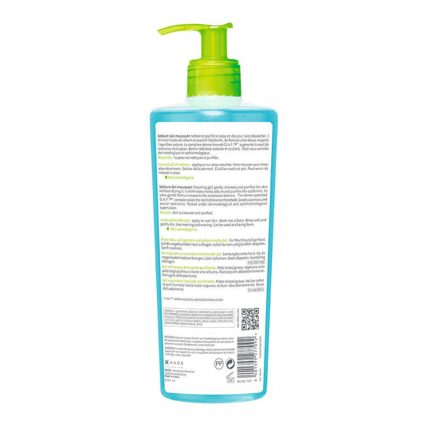 BIODERMA Sébium Gel moussant - мягкое очищающее пенящееся гель для смешанной, жирной и склонной к акне кожи. Эффективно очищает, уменьшает выработку кожного сала, предотвращает закупорку пор, не сушит кожу. Содержит антиоксиданты, сульфаты цинка и меди, сахарную основу D.A.F. для регуляции себума и успокоения кожи.