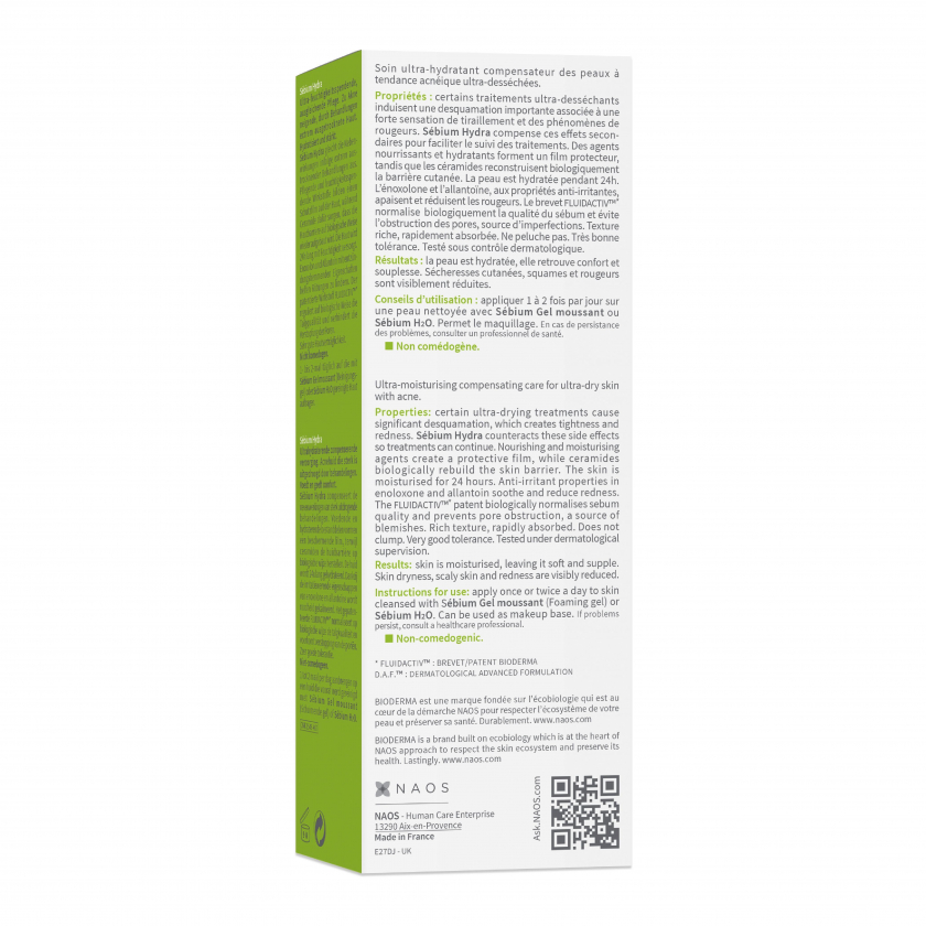 BIODERMA Sébium Hydra - ультраувлажняющий крем для очень сухой кожи, склонной к акне. Обеспечивает интенсивное увлажнение, успокаивает кожу, уменьшает покраснения и воспаления. Подходит для сопровождения дерматологических акне-терапий. Содержит патентованные компоненты FLUIDACTIV™, D.A.F.™ и успокаивающие ингредиенты. Не комедогенный, с высокой переносимостью.