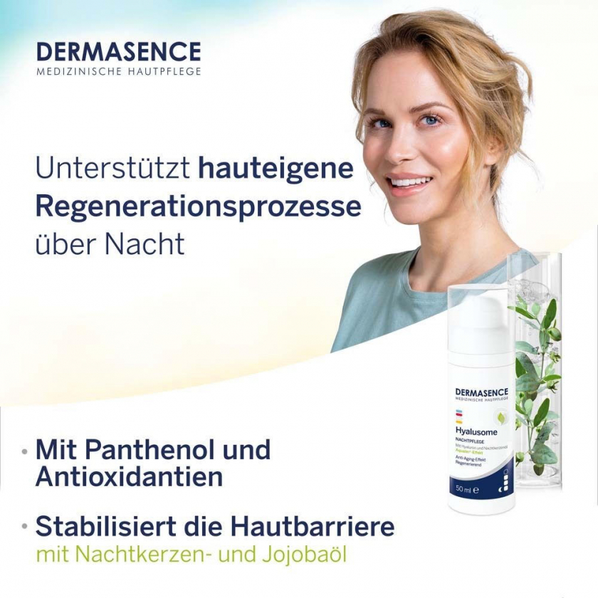 Ночной крем DERMASENCE Hyalusome для интенсивного ухода за сухой и зрелой кожей. Содержит гиалуроновую кислоту для глубокого увлажнения, пантенол и антиоксиданты для регенерации, масла жожоба и вечерней примулы для укрепления кожного барьера. Подходит для использования как ночной крем или маска. Дерматологически протестирован.