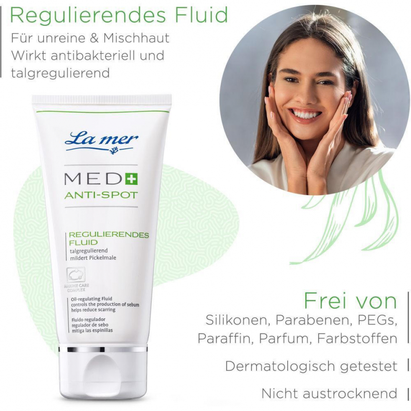 La mer MED+ Anti Spot - регулирующая сыворотка для проблемной кожи. Регулирует выработку кожного сала, уменьшает черные точки и прыщи, успокаивает покраснения, увлажняет кожу и улучшает ее текстуру. Содержит Marine Care Complex из морского ила, зеленых водорослей и морской соли.