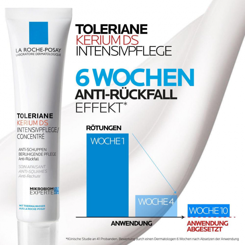 Интенсивный уход La Roche Posay Toleriane Kerium DS для успокоения и ухода за шелушащейся кожей и при себорейном дерматите. Содержит цинк PCA, пироктон оламин и Aqua Posae Filiformis для снижения выработки кожного сала, уменьшения роста Malassezia и восстановления баланса микробиома кожи.