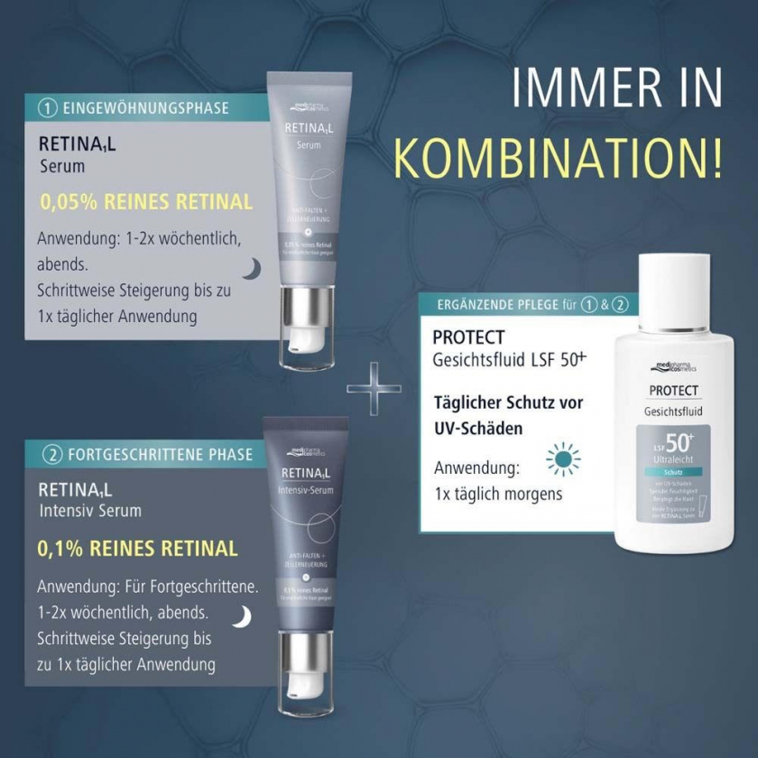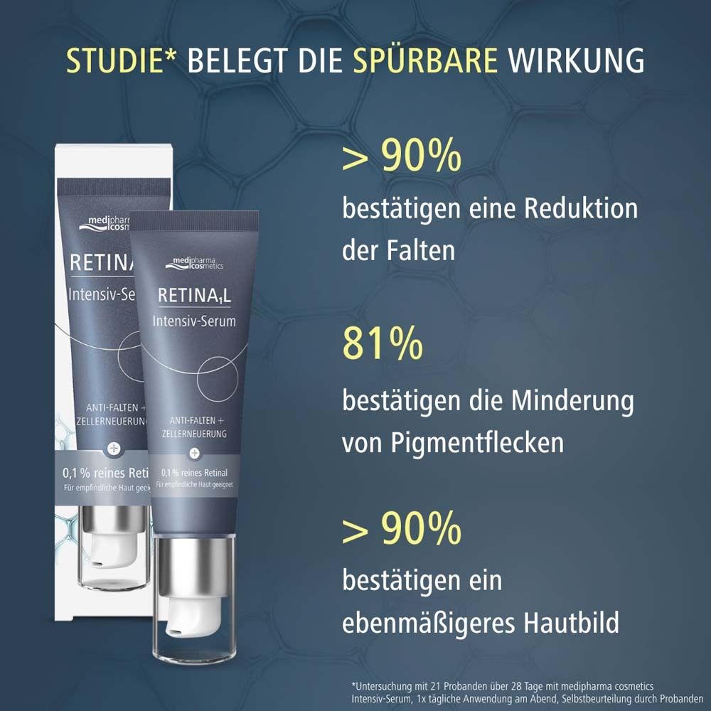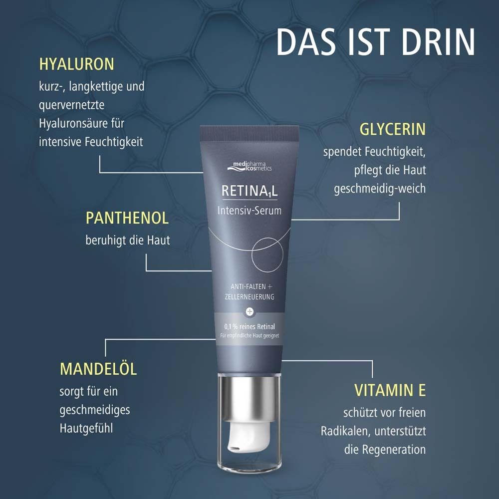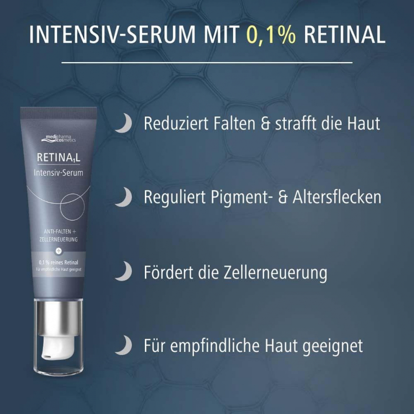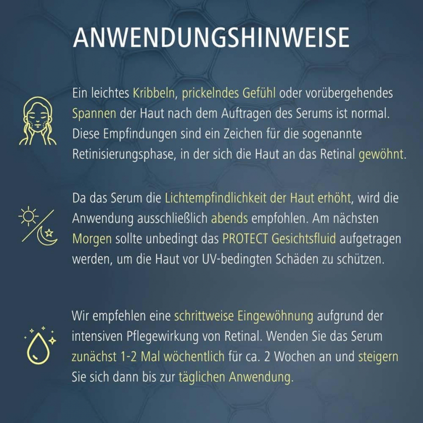 Интенсивная сыворотка с 0,1% ретиналем для зрелой кожи. Уменьшает морщины, улучшает структуру кожи, снижает пигментные пятна и несовершенства. Содержит гиалуроновую кислоту, пантенол, витамин Е и миндальное масло. Применяется вечером с обязательным использованием солнцезащитного крема утром.