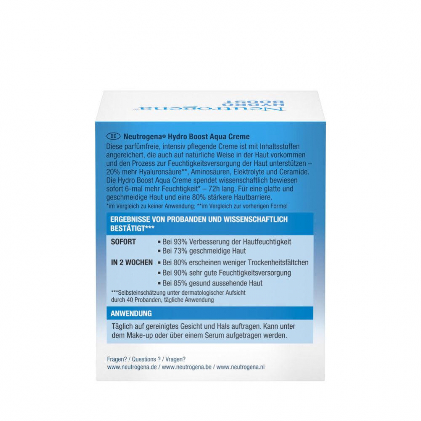 Neutrogena Hydro Boost Aqua Creme - интенсивно увлажняющий крем для сухой кожи с гиалуроновой кислотой и растительной трегалозой. Обеспечивает длительное увлажнение, укрепляет защитный барьер кожи, не содержит парфюма, масел и красителей. Подходит для ежедневного ухода за лицом и шеей.