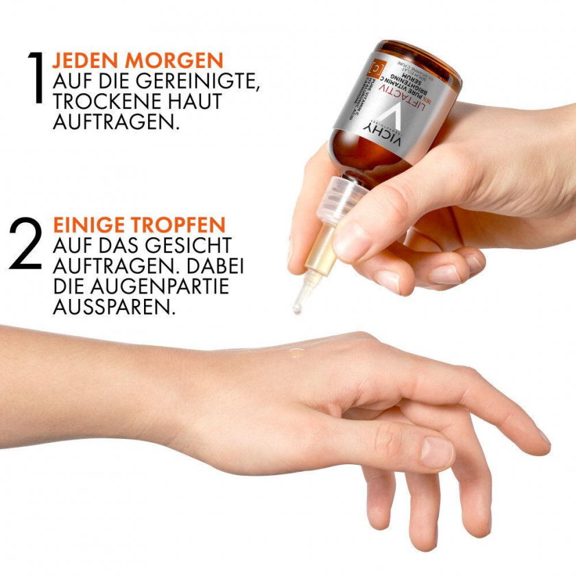 Способ применения: Нанести несколько капель на очищенную кожу лица и шеи, равномерно распределить, избегая области вокруг глаз. После нанесения использовать увлажняющий крем и дневной солнцезащитный крем