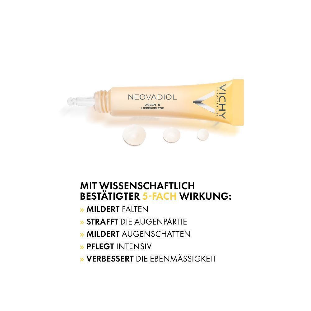 Vichy Neovadiol - антивозрастная крем-уход для глаз и губ, корректирующая видимые гормональные изменения кожи в период менопаузы. Содержит гиалуроновую кислоту, кофеин и ниацинамид для увлажнения, уменьшения отеков и темных кругов под глазами, повышения упругости кожи.