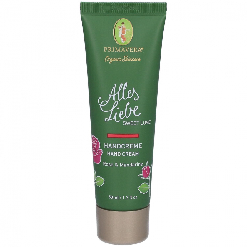 Легкая органическая крем-уход для рук PRIMAVERA Alles Liebe с ароматом розы и мандарина. Содержит натуральные масла жожоба, миндаля, ши и макадамии для интенсивного увлажнения и питания кожи рук. Подходит для ежедневного использования.