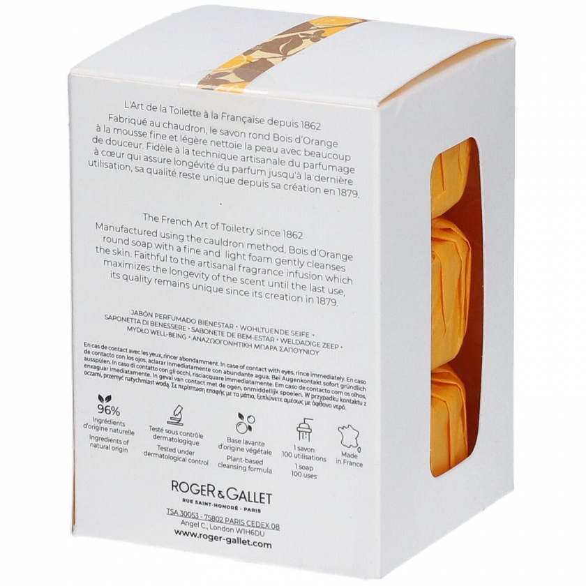 Набор из 3 мыл ROGER & GALLET BOIS D'ORANGE с натуральной эссенцией горького апельсина. Мыло производится по традиционной технологии в медных котлах, содержит 96% натуральных ингредиентов, тестировано под дерматологическим контролем. Обеспечивает бодрость и хорошее настроение с утра благодаря свежему цитрусовому аромату.