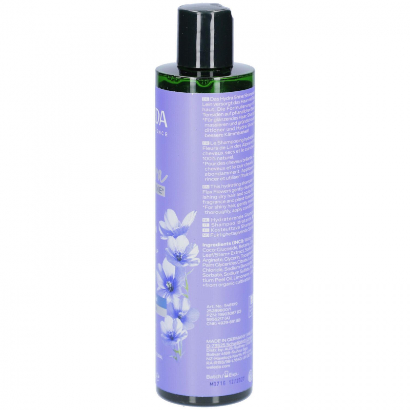 Увлажняющий шампунь Weleda Hydra Shine с гиалуроновой кислотой и альпийским льном для сухих волос. Обеспечивает интенсивное увлажнение, естественный блеск, очищает от загрязнений и кожного сала, ухаживает за кожей головы. Подходит для нормальных и сухих волос, содержит 100% натуральный аромат.