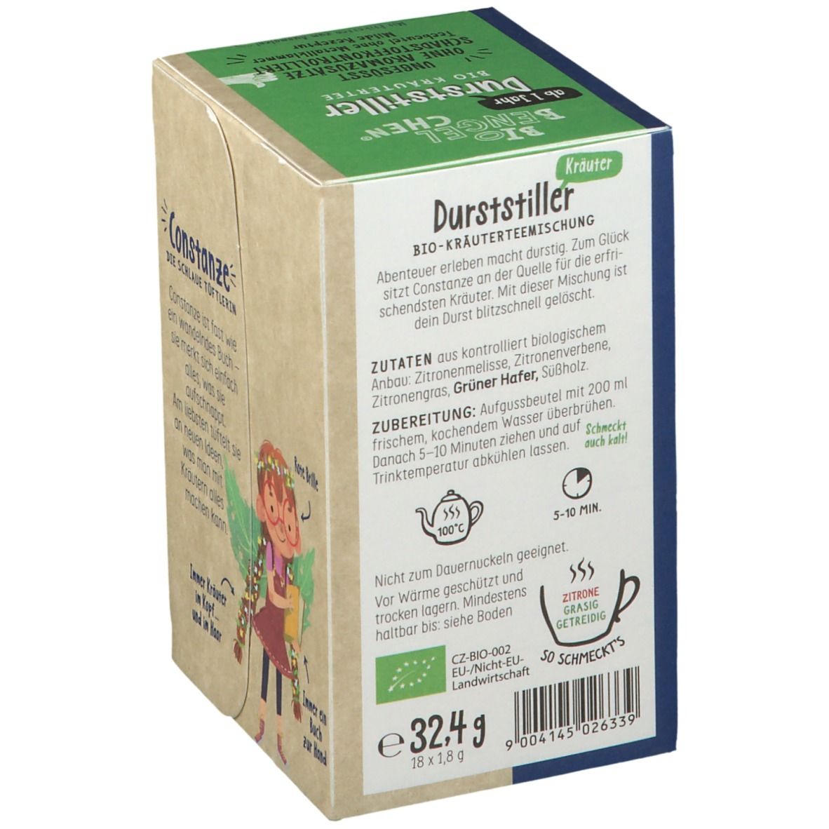 Органический травяной чай SonnentoR Durststiller с освежающим цитрусовым вкусом. Смесь содержит лимонную мелиссу, лимонную вербену, лемонграсс, зеленый овес и солодку. Быстро утоляет жажду, подходит для веганов и вегетарианцев. 18 двойных камерных пакетиков по 1,8 г каждый.