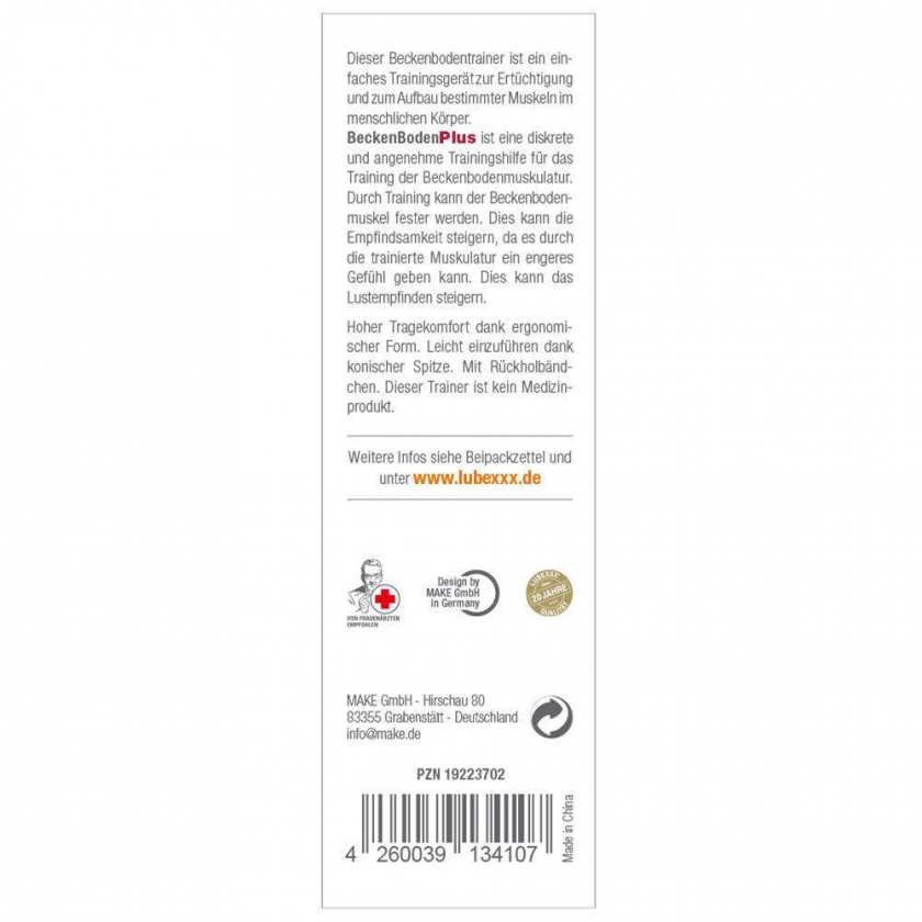 LUBEXXX BeckenBodenPlus - интимный тренажер для тренировки мышц тазового дна. Эргономичная форма обеспечивает комфортное использование, кончик облегчает введение, есть ремешок для извлечения. Укрепление мышц тазового дна может улучшить чувствительность и сексуальные ощущения.