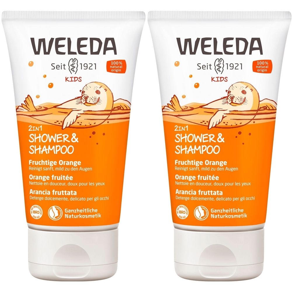 Weleda Kids 2in1 Shower & Shampoo Fruchtige Orange - натуральный детский гель для душа и шампунь 2 в 1 с апельсиновым ароматом. Мягкое и нежное средство для деликатной детской кожи и волос, не щиплет глаза. Содержит питательные ингредиенты, мягкие сахарные тензиды и детские ароматы в веселой упаковке.
