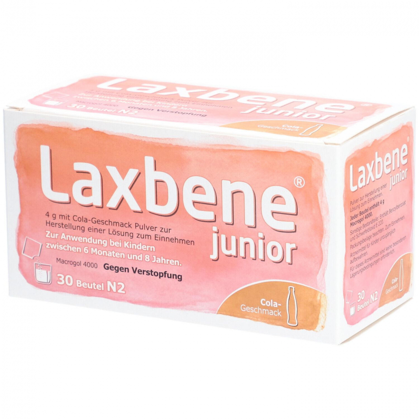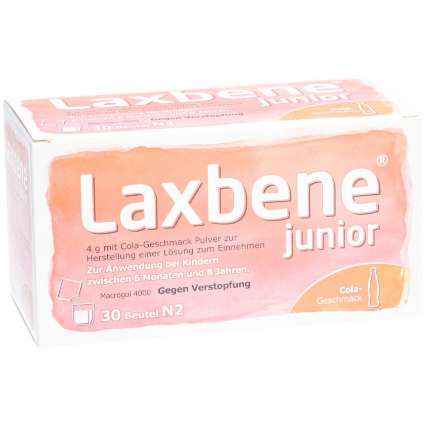 Laxbene junior - слабительное средство для симптоматического лечения запоров у детей от 6 месяцев до 8 лет. Порошок с кола-вкусом содержит макрогол 4000, который увеличивает содержание воды в стуле, облегчая дефекацию. Применяется в сочетании с изменением образа жизни и питания.