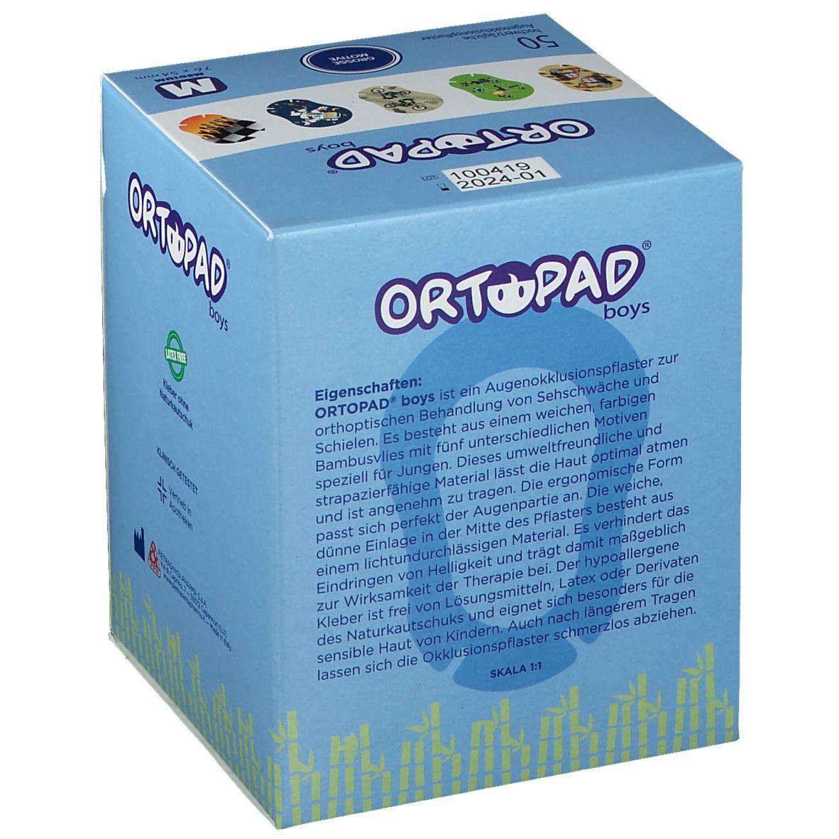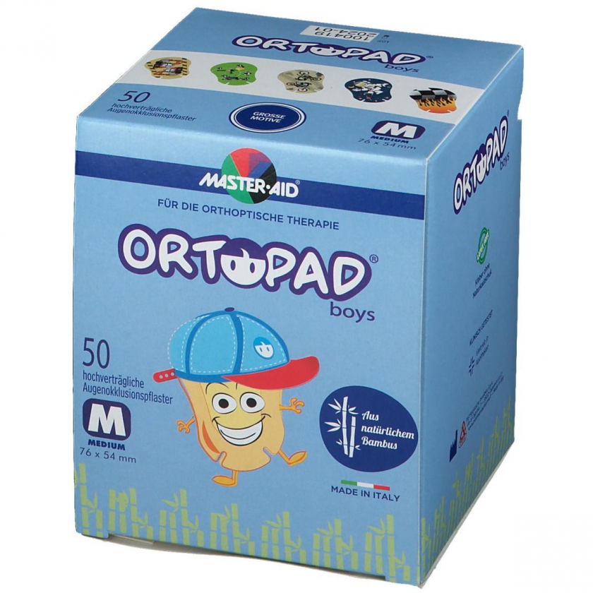 ORTOPAD Cotton Medium Boys - мягкие дышащие глазные пластыри для мальчиков 2-5 лет. Изготовлены из 100% хлопка, светонепроницаемые, воздухопроницаемые, с анатомической формой и носовыми прорезями. Гипоаллергенный клей, без латекса, с блестящими эффектами. Размер 76x54 мм для лечения амблиопии.