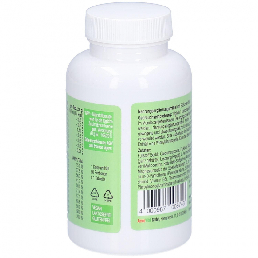 Состав: Сорбит (сахарозаменитель), карбонат кальция, фруктоза, лимонная кислота (подкислитель), крахмал, растительные жиры (гидрогенизированные), витамин C, ароматизаторы, мальтодекстрин, никотинамид, стеарат магния (антислеживающий агент), витамин E, свекольный сок (краситель), витамин B1, витамин B2, фолиевая кислота, биотин, витамин B12