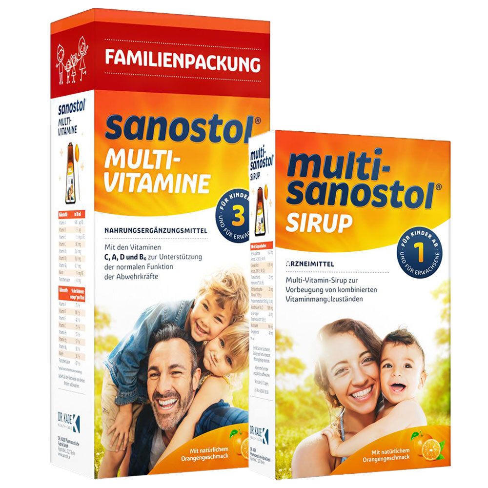 Набор из двух витаминных сиропов для детей от 1 года: Multi-Sanostol® Sirup (300 г) и Sanostol® Multi-Vitamine Saft (780 мл). Комплекс витаминов A, D, E, C, группы B для профилактики витаминной недостаточности, поддержки иммунитета и нормального развития детей. Рекомендуется в периоды роста, снижения аппетита или повышенной потребности в витаминах.