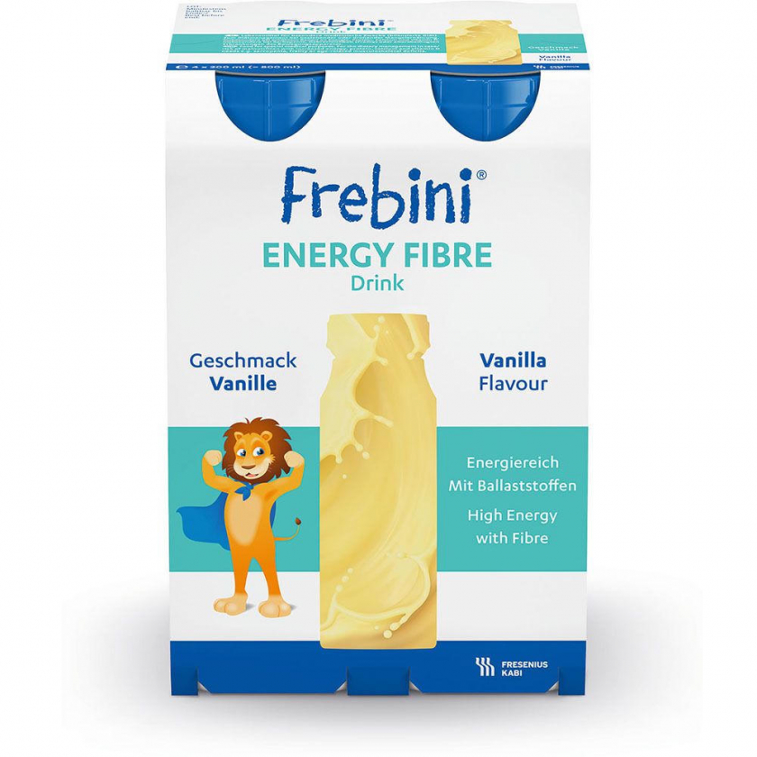 Frebini Energy Fibre - высококалорийная питательная смесь для детей 1-12 лет при недостаточном питании или повышенных энергетических потребностях. Содержит комплекс витаминов, минералов, белков и клетчатки. Без лактозы и глютена, с ванильным вкусом. Используется под врачебным наблюдением как полное или дополнительное питание.