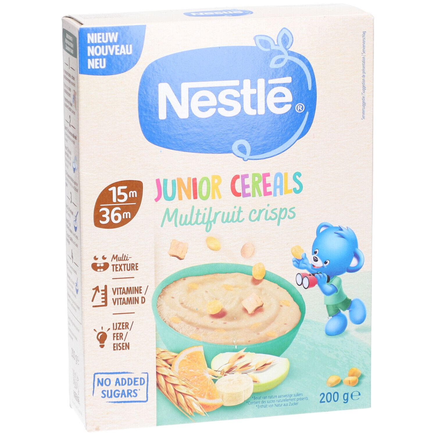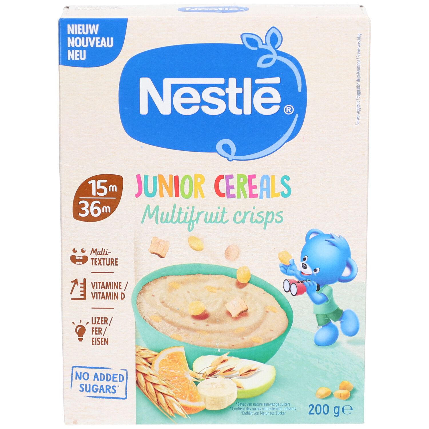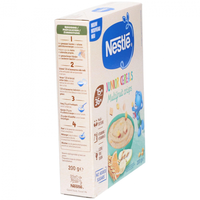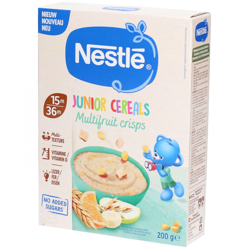 Детские хлопья Nestlé Junior Cereals Multifruit Crisps для детей от 15 до 36 месяцев. Обогащены железом и витамином D, содержат фруктовые кусочки, без добавления сахара. Идеальный питательный завтрак для малышей.