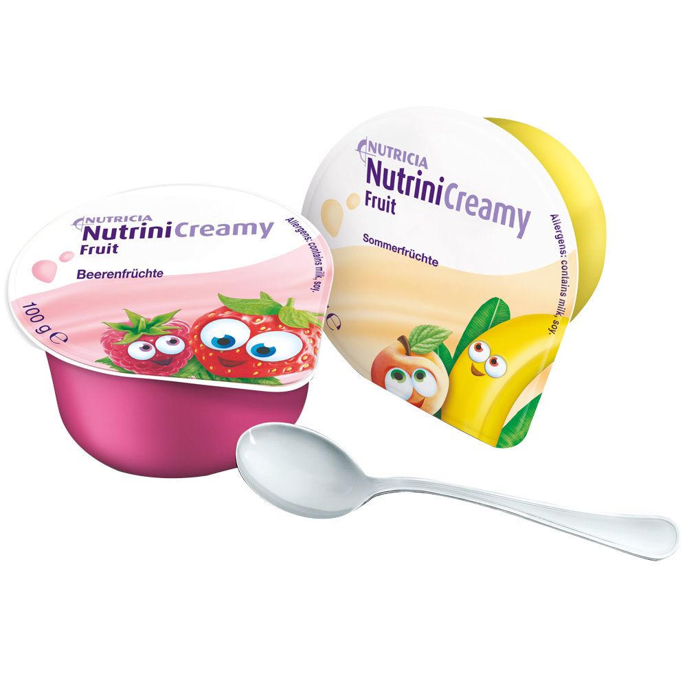 Nutrini Creamy Fruit - высококалорийная консистенционно-адаптированная питьевая пища для детей от 12 месяцев с летними фруктами и ягодами. Специализированное питание для диетического управления при заболеваниях, связанных с недостаточностью питания у детей. Содержит настоящие фрукты, пищевые волокна, без глютена, подходит для исключительного питания при нарушениях развития и заболеваниях.