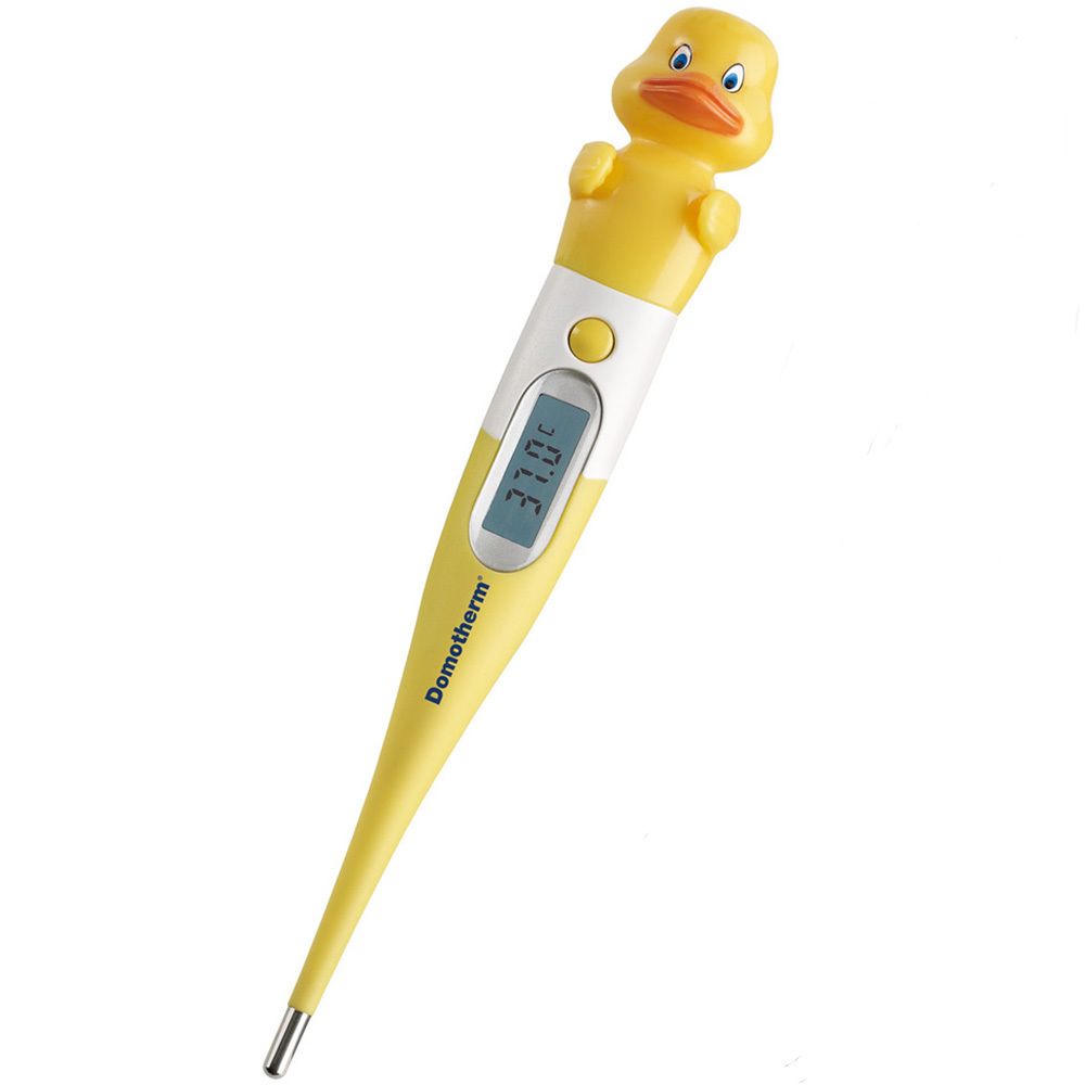 Детский термометр Domotherm Junior Ente с гибким наконечником и веселыми животными мотивами для легкого измерения температуры у детей. Подходит для ректального, орального и подмышечного измерения с разным временем измерения: 30 секунд ректально, 60 секунд орально, 3 минуты под мышкой.