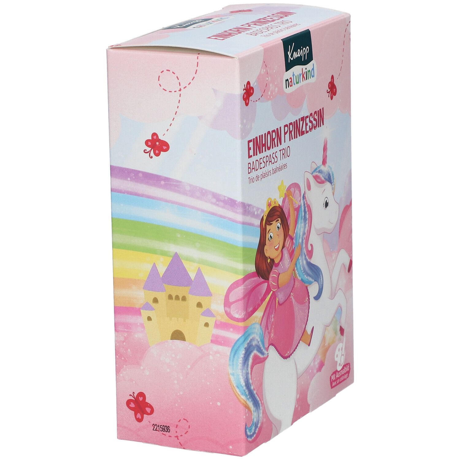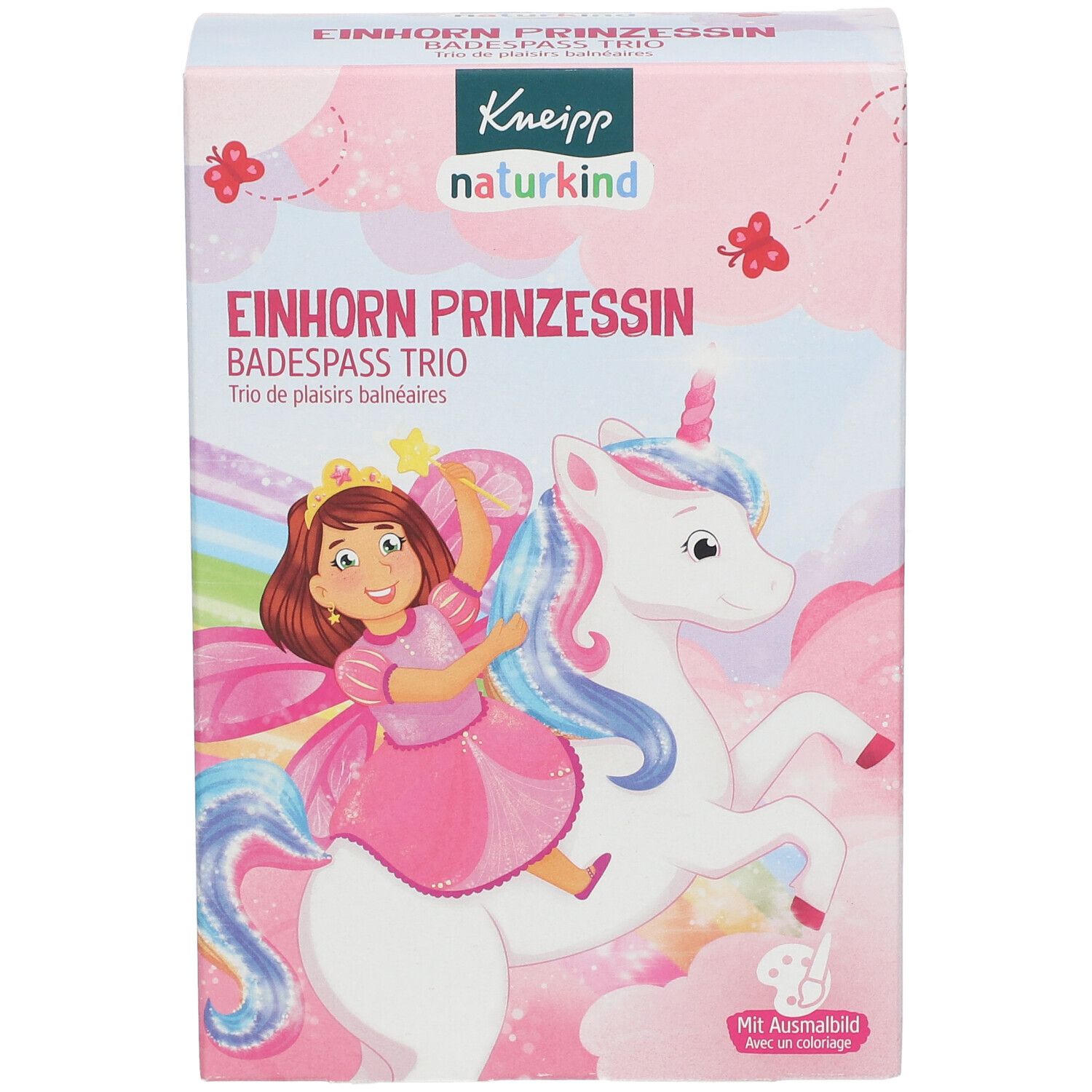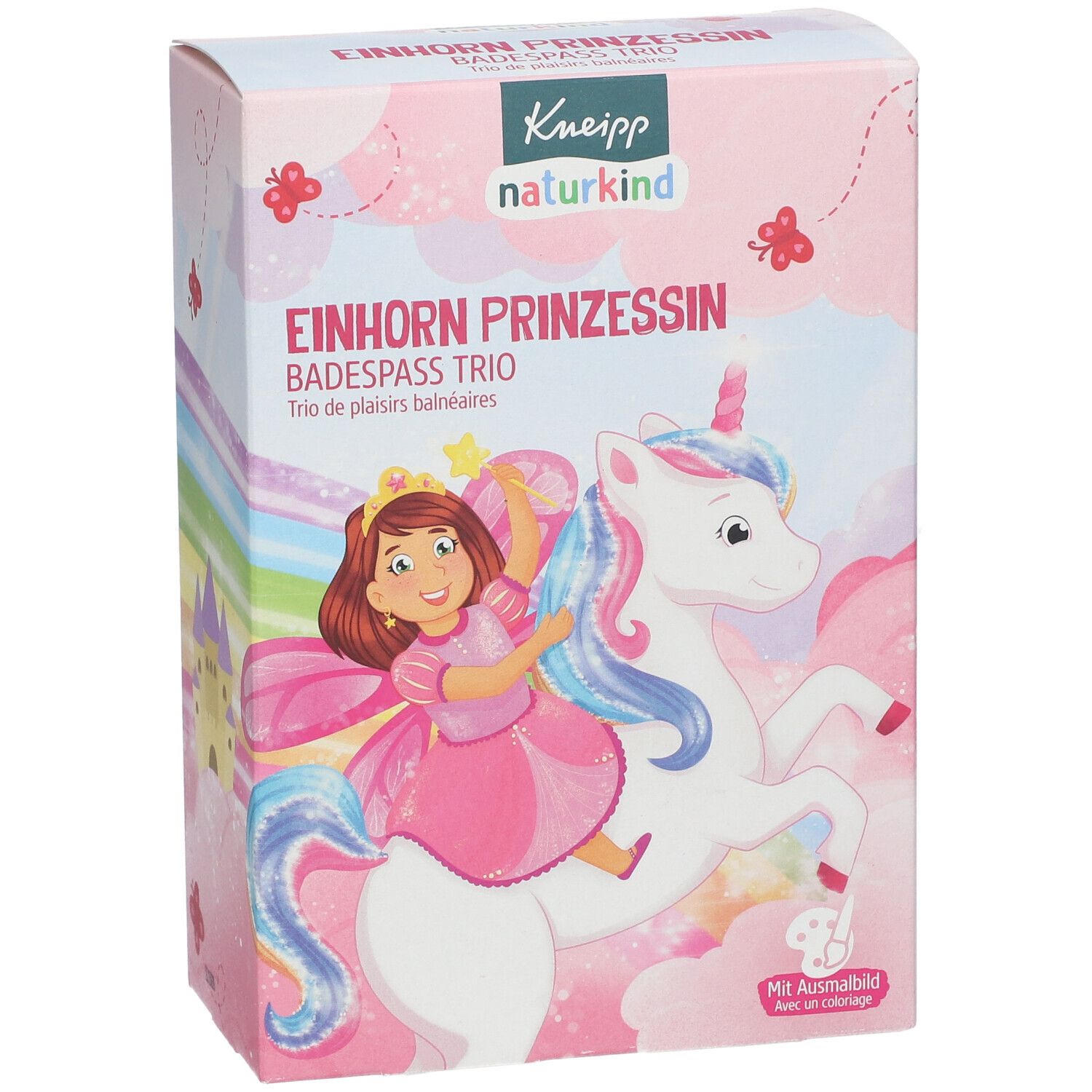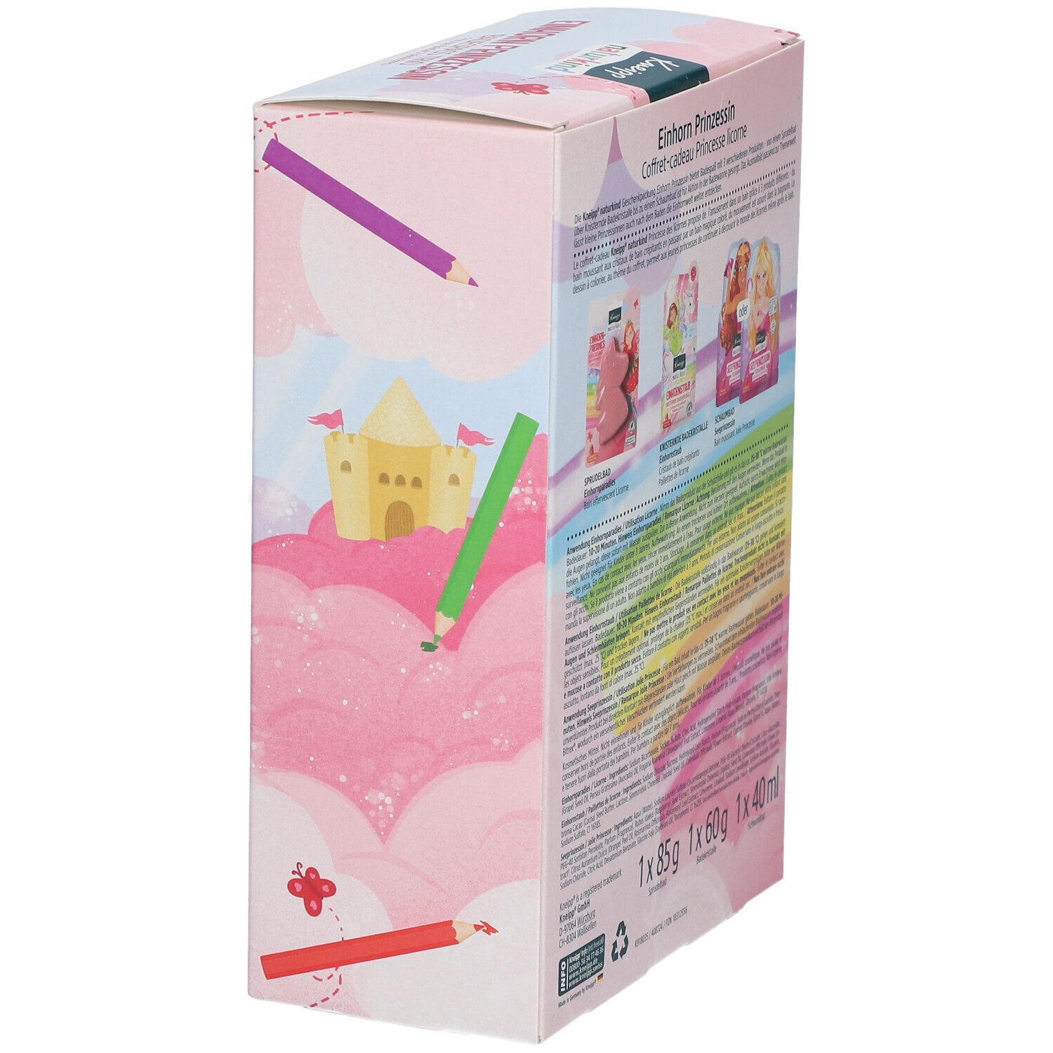 Детский подарочный набор для ванны Kneipp Naturkind с тематикой единорога и принцессы. Включает три продукта: шипучий бальзам, кремниевые кристаллы и пенку для ванны. Подходит для детей от 3 лет, создает веселую атмосферу купания с различными эффектами (пена, цвет, шипение). В набор входит раскраска на внутренней стороне упаковки.