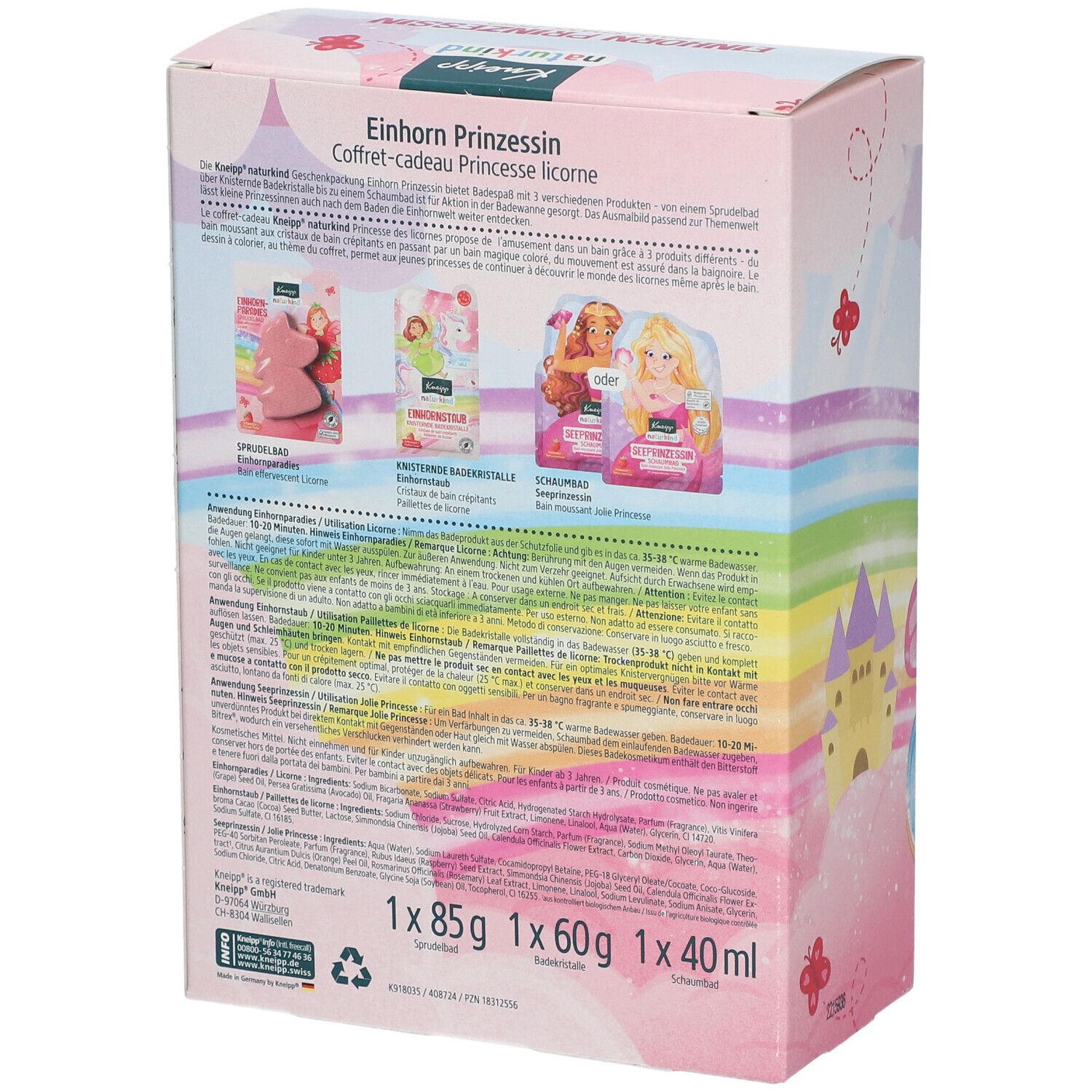 Набор из трех продуктов: 1) Einhornparadies (шипучий бальзам): Sodium Bicarbonate, Sodium Sulfate, Citric Acid, Hydrogenated Starch Hydrolysate, Parfum, Vitis Vinifera Seed Oil, Persea Gratissima Oil, Fragaria Ananassa Fruit Extract, Limonene, Linalool, Aqua, Glycerin, CI 14720. 2) Einhornstaub (кристаллы для ванны): Sodium Chloride, Sucrose, Hydrolyzed Corn Starch, Parfum, Sodium Methyl Oleoyl Taurate, Theobroma Cacao Seed Butter, Lactose, Simmondsia Chinensis Seed Oil, Calendula Officinalis Flower Extract, Carbon Dioxide, Glycerin, Aqua, Sodium Sulfate, CI 16185. 3) Seeprinzessin (пенка для ванны): Aqua, Sodium Laureth Sulfate, Cocamidopropyl Betaine, PEG-18 Glyceryl Oleate/Cocoate, Coco-Glucoside, PEG-40 Sorbitan Peroleate, Parfum, Rubus Idaeus Seed Extract, Simmondsia Chinensis Seed Oil, Calendula Officinalis Flower Extract, Citrus Aurantium Dulcis Peel Oil, Rosmarinus Officinalis Leaf Extract, Limonene, Linalool, Sodium Levulinate, Sodium Anisate, Glycerin, Sodium Chloride, Citric Acid, Denatonium Benzoate, Glycine Soja Oil, Tocopherol, CI 16255.
