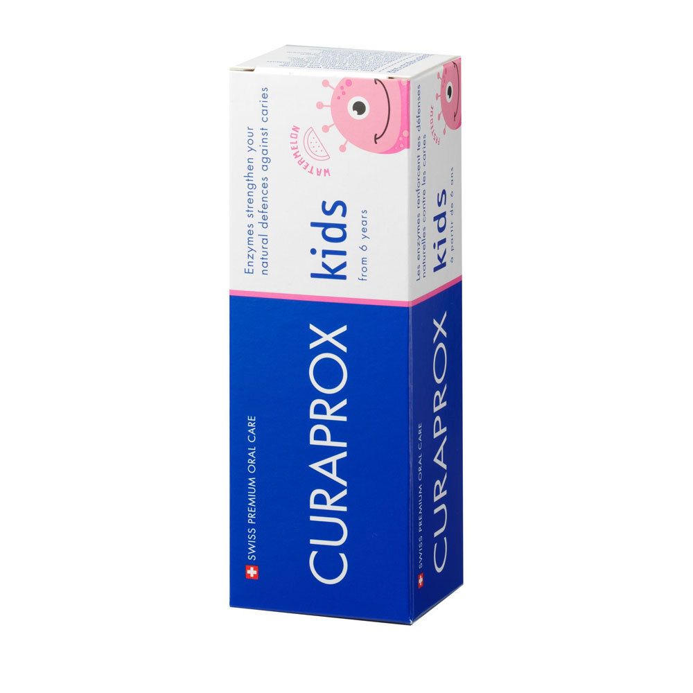 Детская зубная паста CURAPROX kids с ароматом арбуза для защиты зубов детей от 6 лет. Содержит 1450 ppm фторида для реминерализации эмали, ферменты для поддержки естественной защиты слюны и ксилит для нейтрализации кислот. Без SLS, микропластика и триклозана.