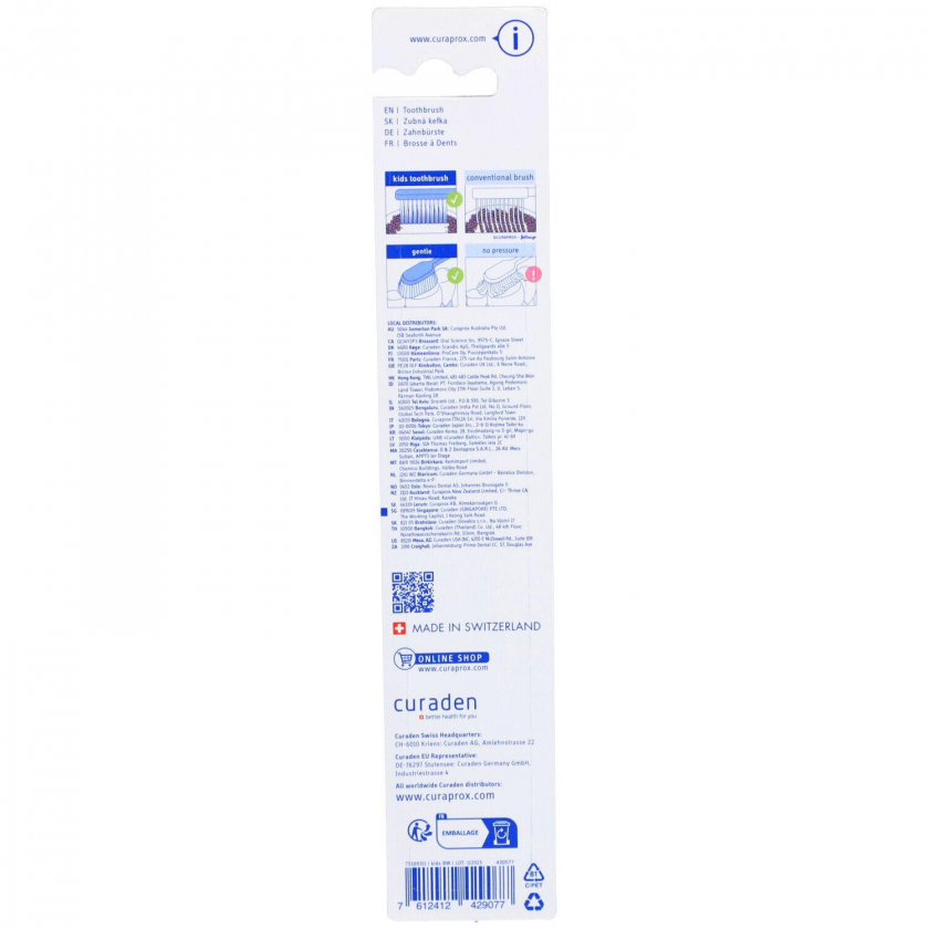 Детская зубная щетка Curaprox для детей от 4 лет с мягкими закругленными щетинками и эргономичной ручкой. Небольшая головка щетки и нескользящая восьмиугольная ручка идеально подходят для детских рук, обеспечивая бережную чистку зубов и десен.